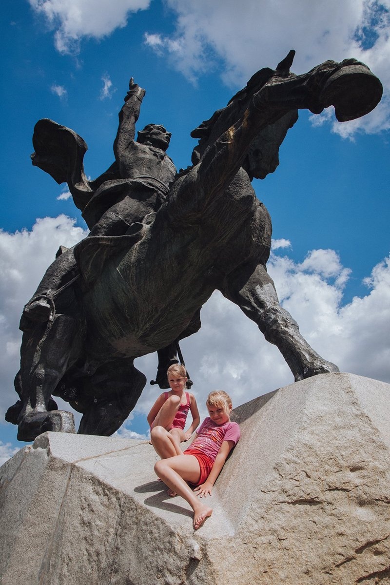 | Trẻ em vui chơi dưới tượng đài tướng Suvorov tại Tiraspol. Ông Suvorov vốn là người Nga đã sáng lập thành phố sau cuộc chiến chống Đế quốc Ottomans (hay Đế quốc Thổ Nhĩ Kỳ) vào năm 1792. |