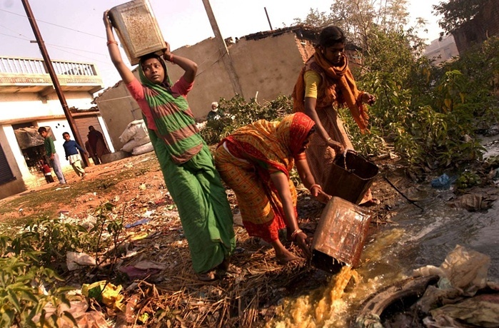 | Phụ nữ Dalit ở Ranchi, bang Jharkand, Ấn Độ, thu gom chất thải từ nhà vệ sinh và trút ra con suối ngay gần khu vực sinh sống của họ. |
