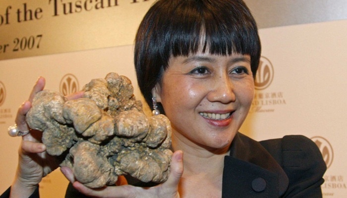 Tỷ phú này còn rất mê những loại nấm đắt giá. Ông từng chi ra 500.000 USD cho một loại nấm trắng nặng 1,5kg. Trong ảnh là Angela Leong, vợ của Stanley Ho với cây nấm trong cuộc đấu giá. |