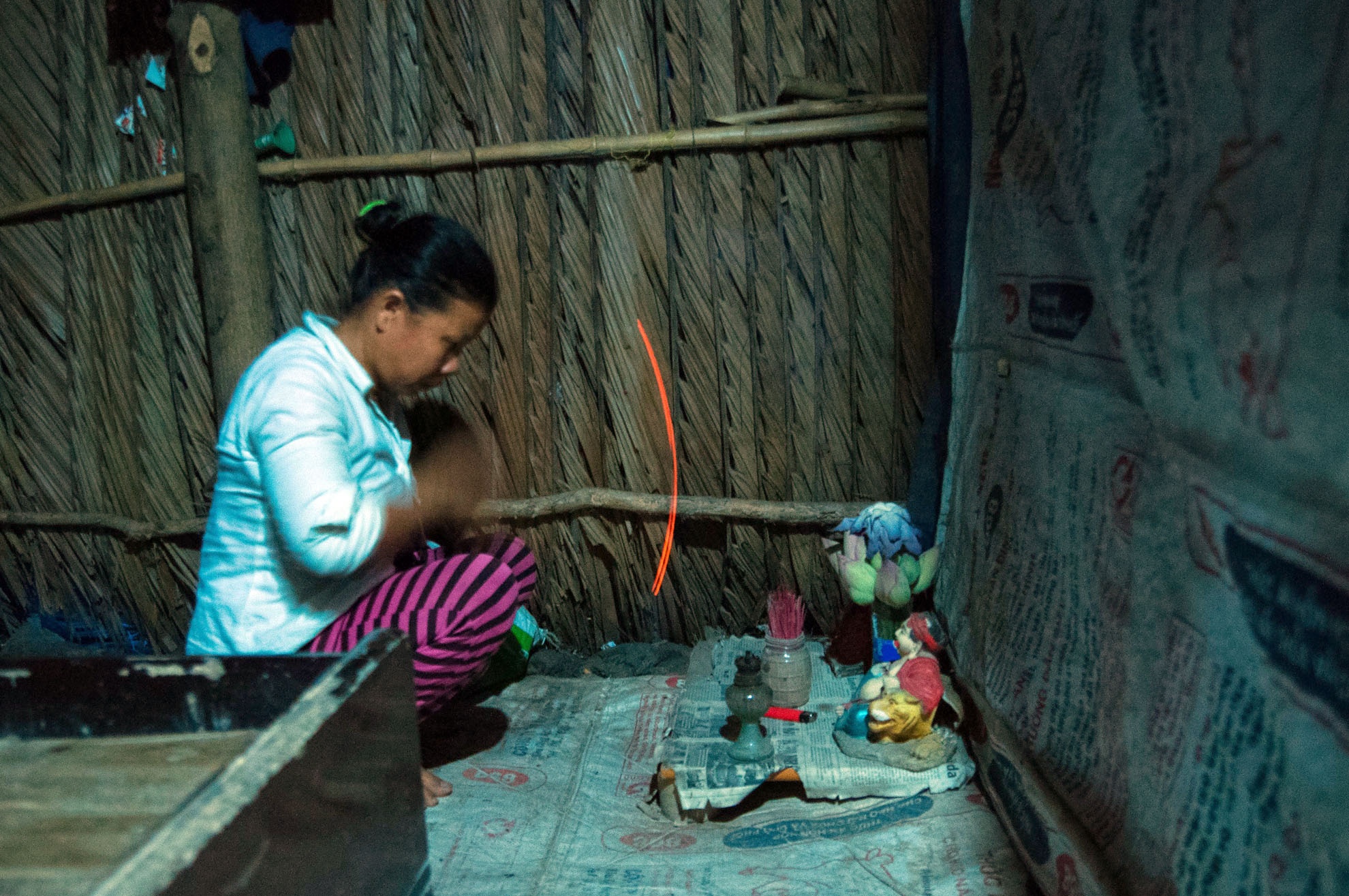 | Trong căn nhà lợp tạm bằng lá dừa và vài cây chống, chị Đẹt dọn dẹp sạch sẽ một góc để đặt bàn thờ. Đây là nơi chị thắp nhang hàng ngày cầu mong gia đình mình không ốm đau, bệnh tật. |
