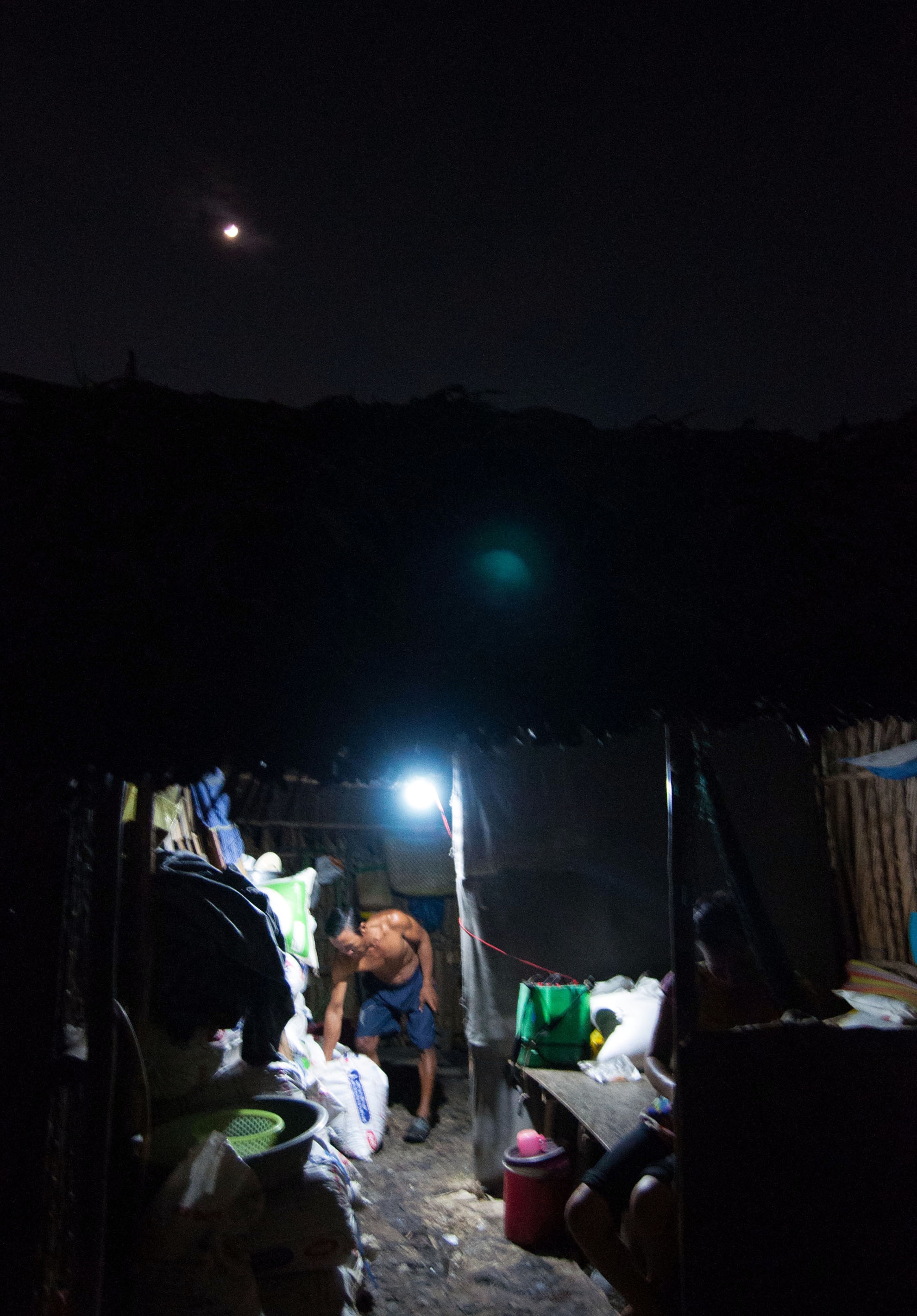 | Gia đình chị Bùi Thị Đẹt (46 tuổi, quê Sóc Trăng) là một trong những hộ sống lâu năm ở đây. Chị kể: "Hồi mới tới, chồng đi làm bốc vác ban đêm chỉ còn tôi với con gái ở nhà cùng chiếc đèn dầu, không đủ chiếu sáng nên cũng thấy sợ sợ. Nhưng ở lâu rồi thành quen, giờ cảm thấy thấy bình thường". Chị Đẹt vẫn dùng chiếc đèn dầu mua từ nhiều năm trước. |