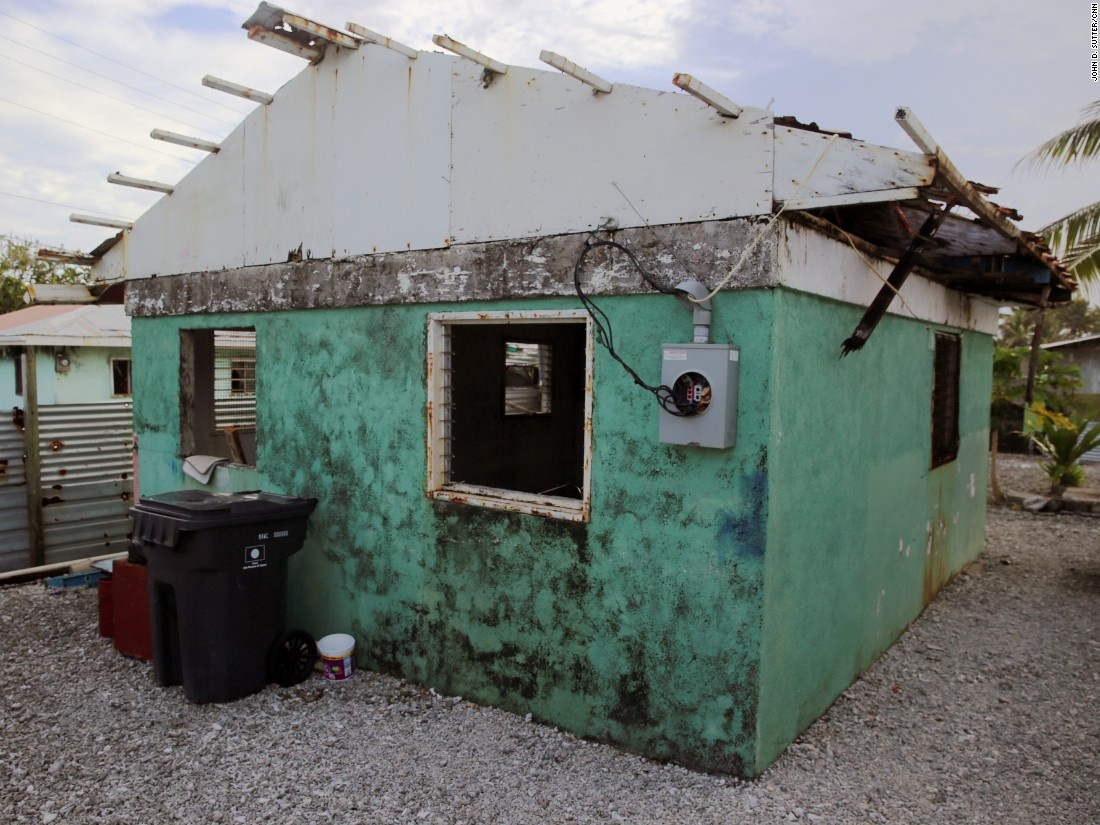Một ngôi nhà bị phá hủy trong lũ. Đất ở Marshall do người đứng đầu cộng đồng quản lý, vì vậy, các gia đình có thể sống cùng nhau trong các cụm dân cư.