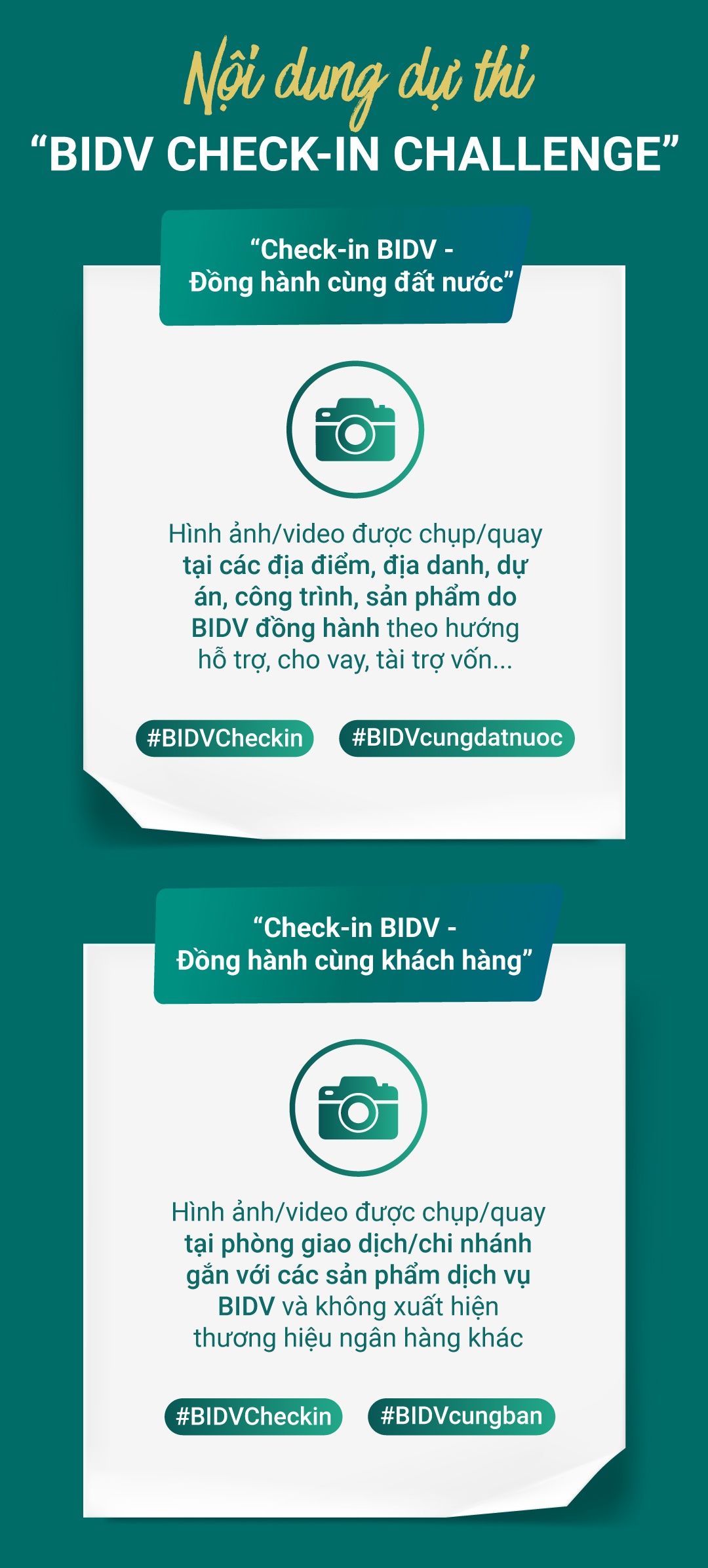 Bài dự thi là ảnh/video check-in tại các địa điểm, địa danh có dự án, công trình do BIDV đồng hành tài trợ vốn hoặc phòng giao dịch, chi nhánh của ngân hàng và đảm bảo không xuất hiện thương hiệu ngân hàng khác.