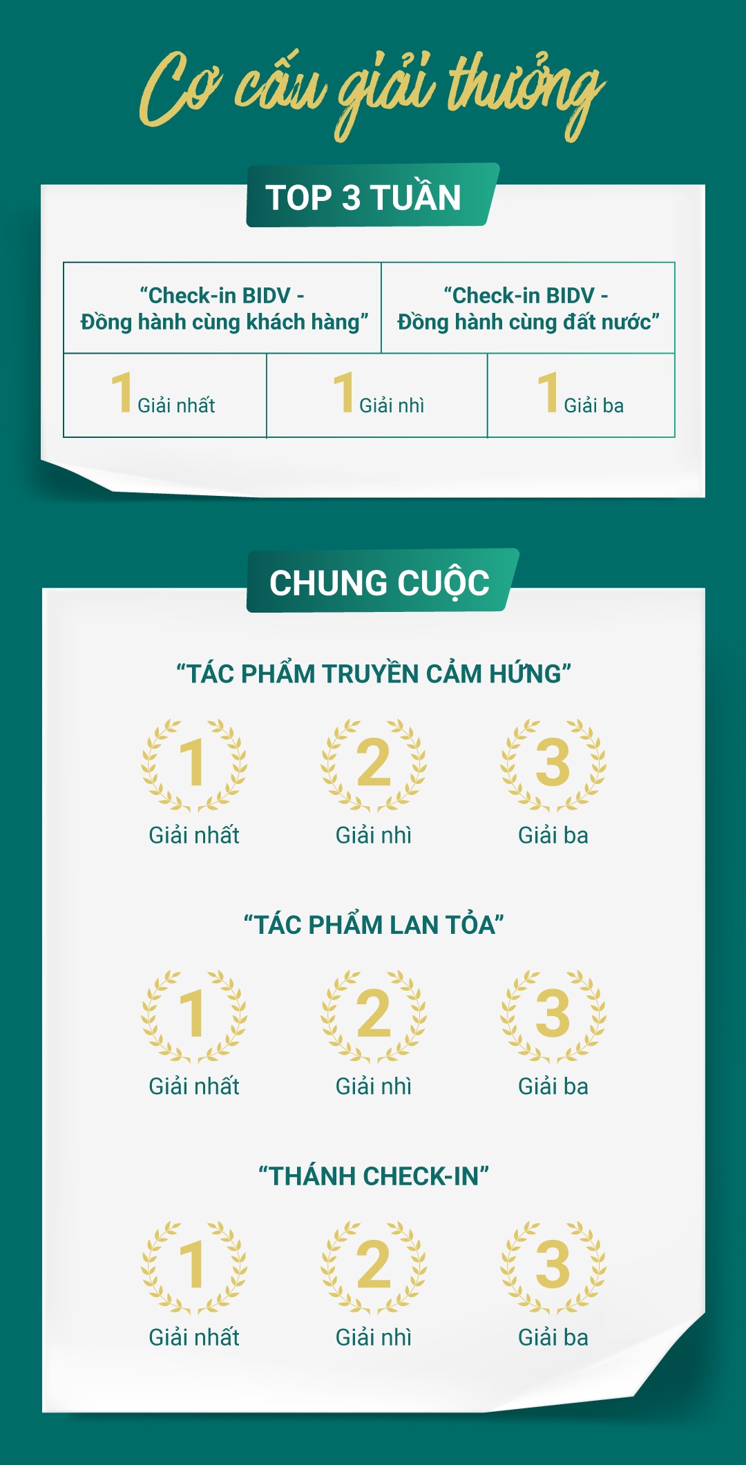 Tổng giá trị giải thưởng của “BIDV check-in challenge” là 380 triệu đồng, gồm 2 hạng mục: Giải tuần cho top 3 bài dự thi có nhiều tương tác nhất tuần; giải chung cuộc cho các bài dự thi có nhiều tương tác nhất, check-in nhiều địa điểm nhất, truyền cảm hứng nhất (do ban tổ chức bình chọn). Độc giả xem chi tiết cơ cấu giải thưởng tại đây.