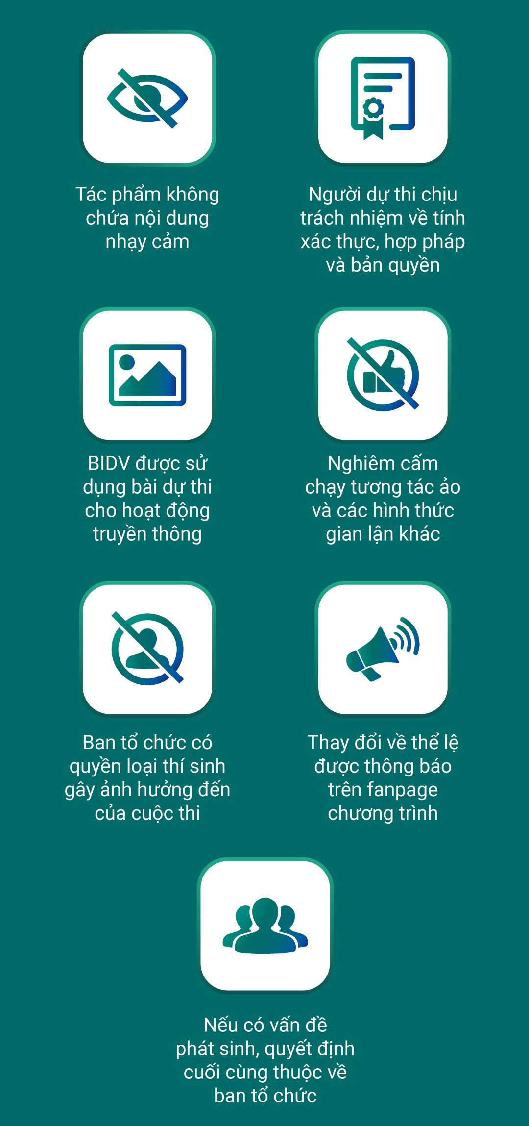 Thí sinh cũng cần chịu trách nhiệm về tính xác thực, hợp pháp, bản quyền,… của tác phẩm dự thi và trung thực trong suốt quá trình tham gia. Bài dự thi xuất sắc sẽ được sử dụng cho hoạt động truyền thông của BIDV. Ngân hàng cũng có quyền loại thí sinh gây ảnh hưởng đến kết quả chung cuộc và ra quyết định cuối cùng khi phát sinh vấn đề. Để biết mọi thông tin chi tiết về cuộc thi, độc giả liên hệ email bidvcheckinchallenge@gmail.com.