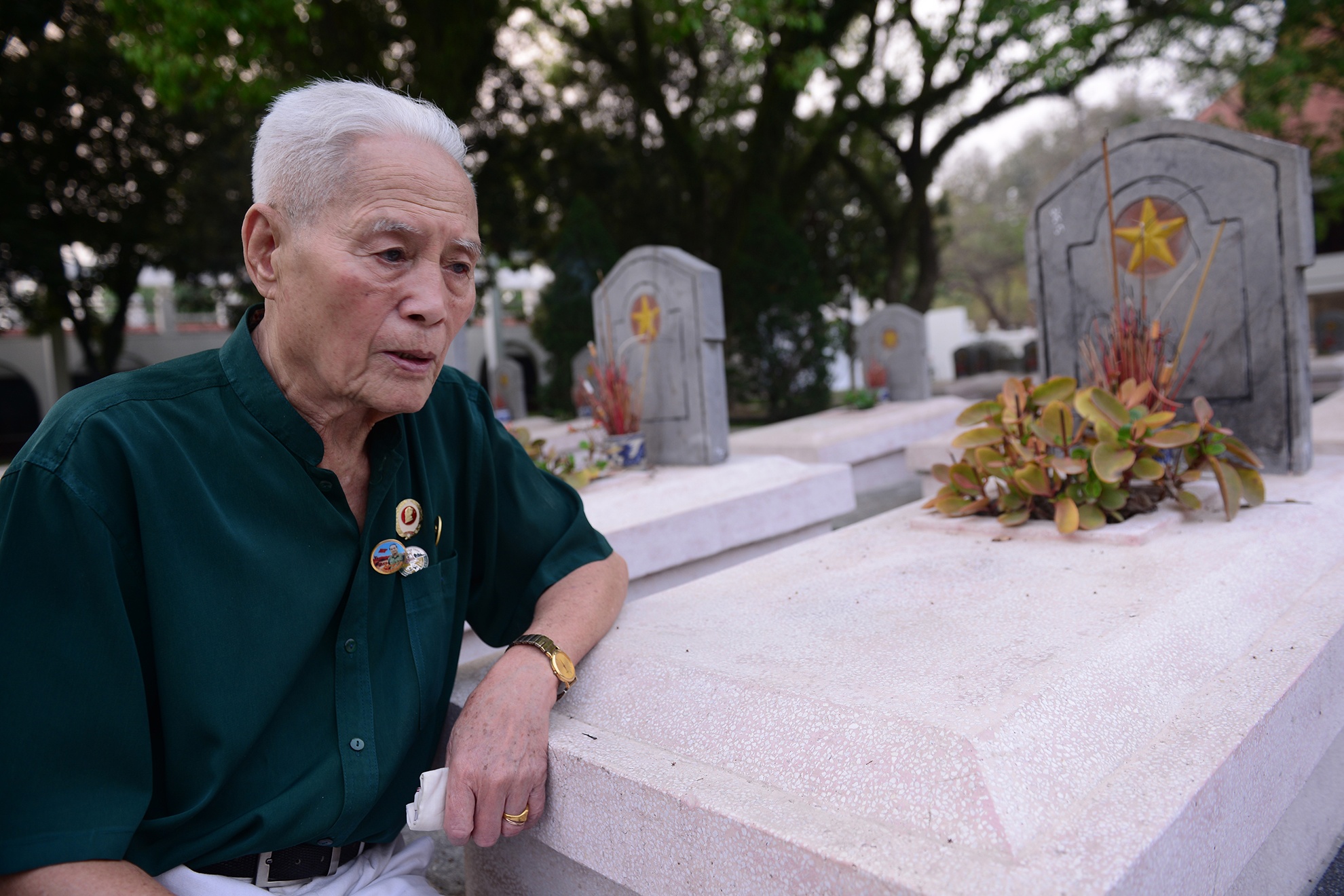 Ông Tuấn Linh - người chiến sĩ Điện Biên năm xưa, từ Sài Gòn ra thăm những đồng đội nằm xuống ở Nghĩa trang đồi A1 đã không ngăn được dòng nước mắt.