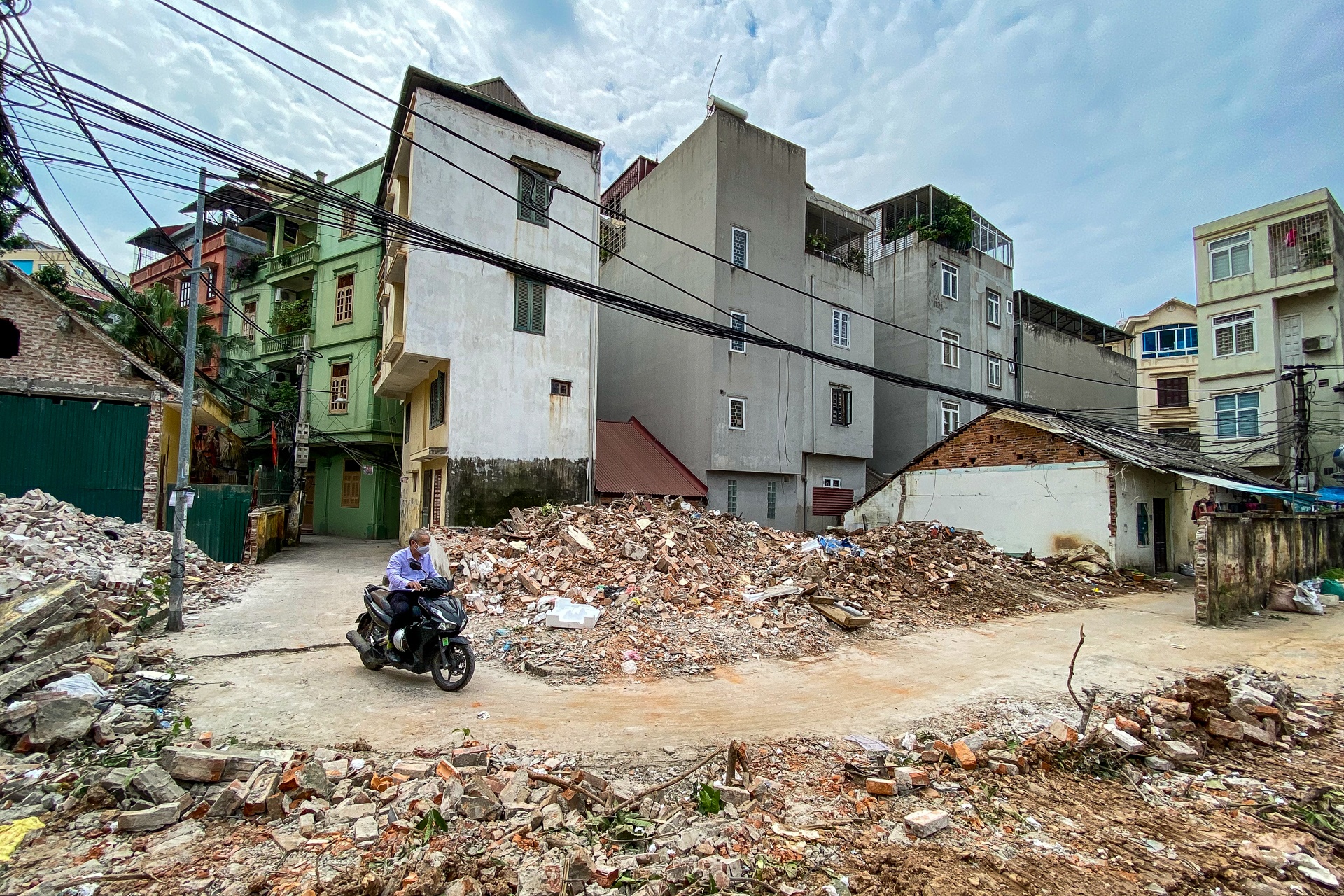Khoảng 700 m đường Huỳnh Thúc Kháng kéo dài từ nút giao Voi Phục đến đoạn giao cắt Chùa Láng đã thành hình. Hiện nay, tiến độ dự án bị ảnh hưởng do vướng giải phóng mặt bằng. Hình ảnh tại ngõ 14 phố Pháo Đài Láng, ngổn ngang đất đá, phế thải xây dựng, gây ảnh hưởng tới sinh hoạt của người dân. Ảnh: Việt Linh.