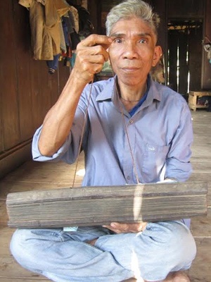 Khi được hỏi về cuốn sách lá có hình thù… không giống ai mà mình đang cất giữ, Hồ Thoong vào nhà trong xách ra một bó nhỏ vừa hai tay cầm có hai thanh gỗ hai bên.