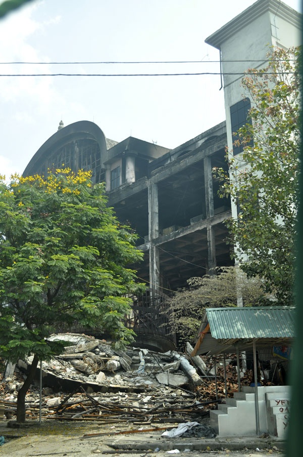 Theo đó, những người dân ở các phố xung quanh 3 mặt của tòa nhà TTTM sẽ phải di dời. Theo quan sát của chúng tôi, hàng rào cảnh báo được dựng lên cách hiện trường vụ cháy khoảng 25m. Những hộ dân nằm trong bán kính 30m đều trong phạm vi phải di dời.