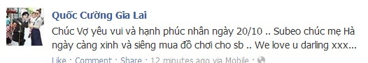 Cường "đô la" nhí nhảnh: "Chúc vợ yêu vui và hạnh phúc nhân ngày 20/10. Subeo chúc mẹ Hà ngày càng xinh đẹp và siêng mua đồ chơi cho Subeo. We love you darling".