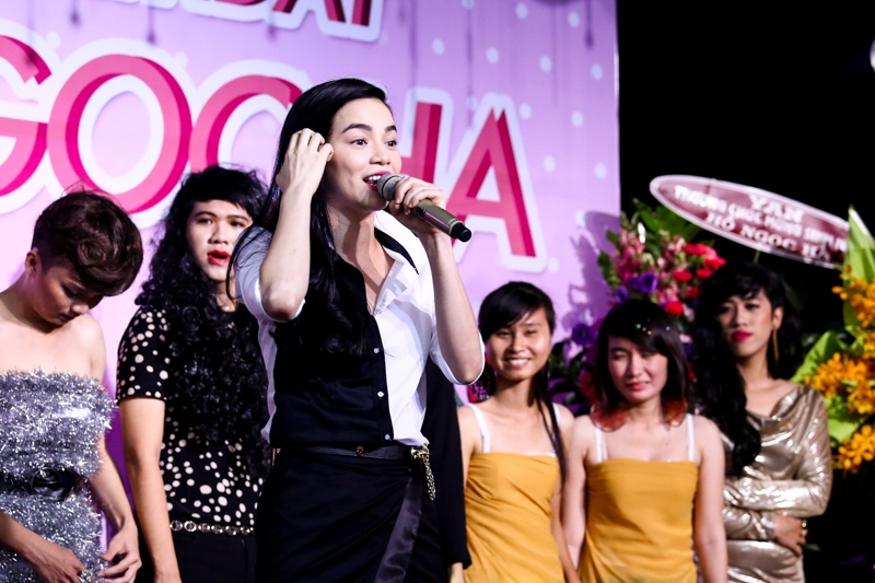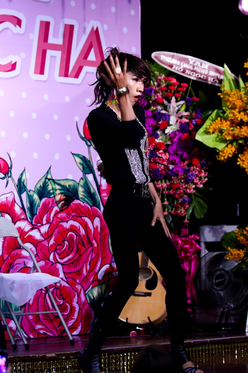 | Thích thú trước món quà có 1-0-2 này, cô không ngần ngại mặc luôn trên sân khấu. |