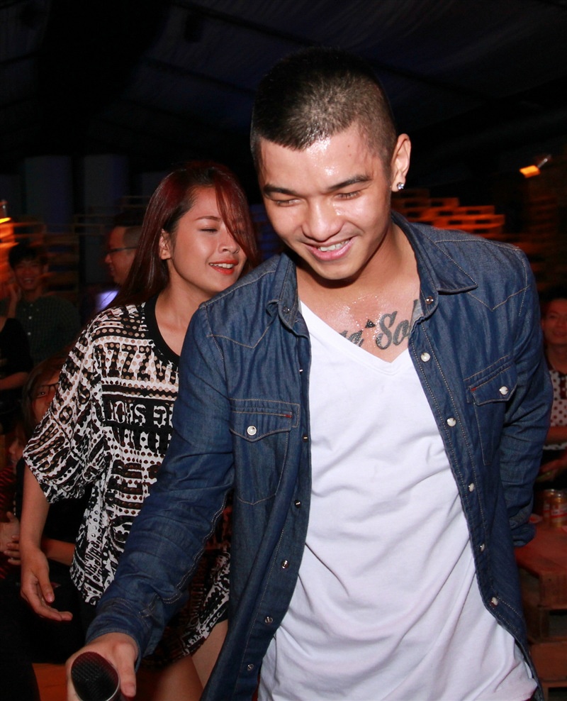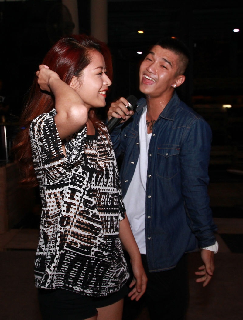| Cường Seven chủ động khoác tay, ôm chặt Chi Pu trên sân khấu. |
