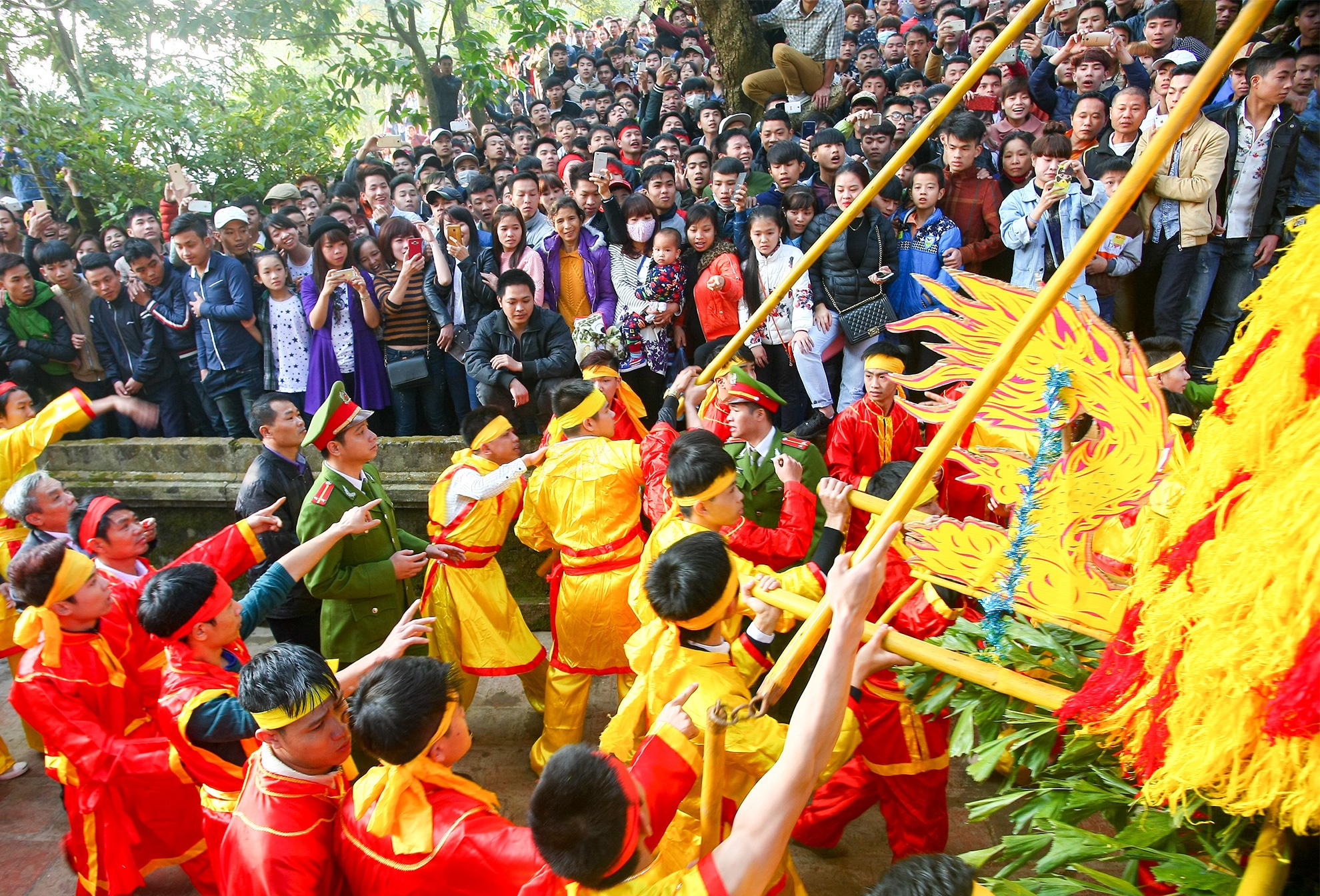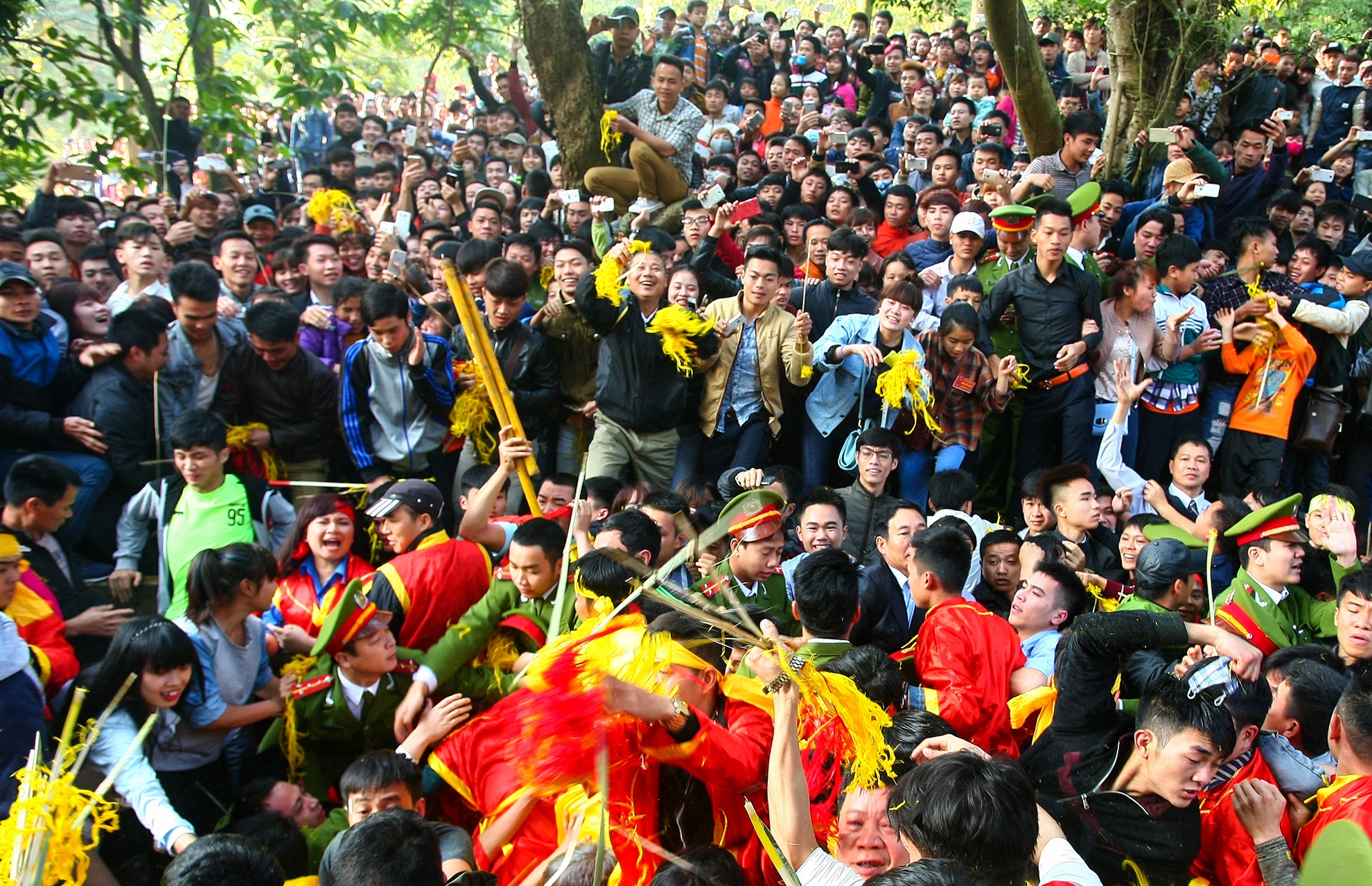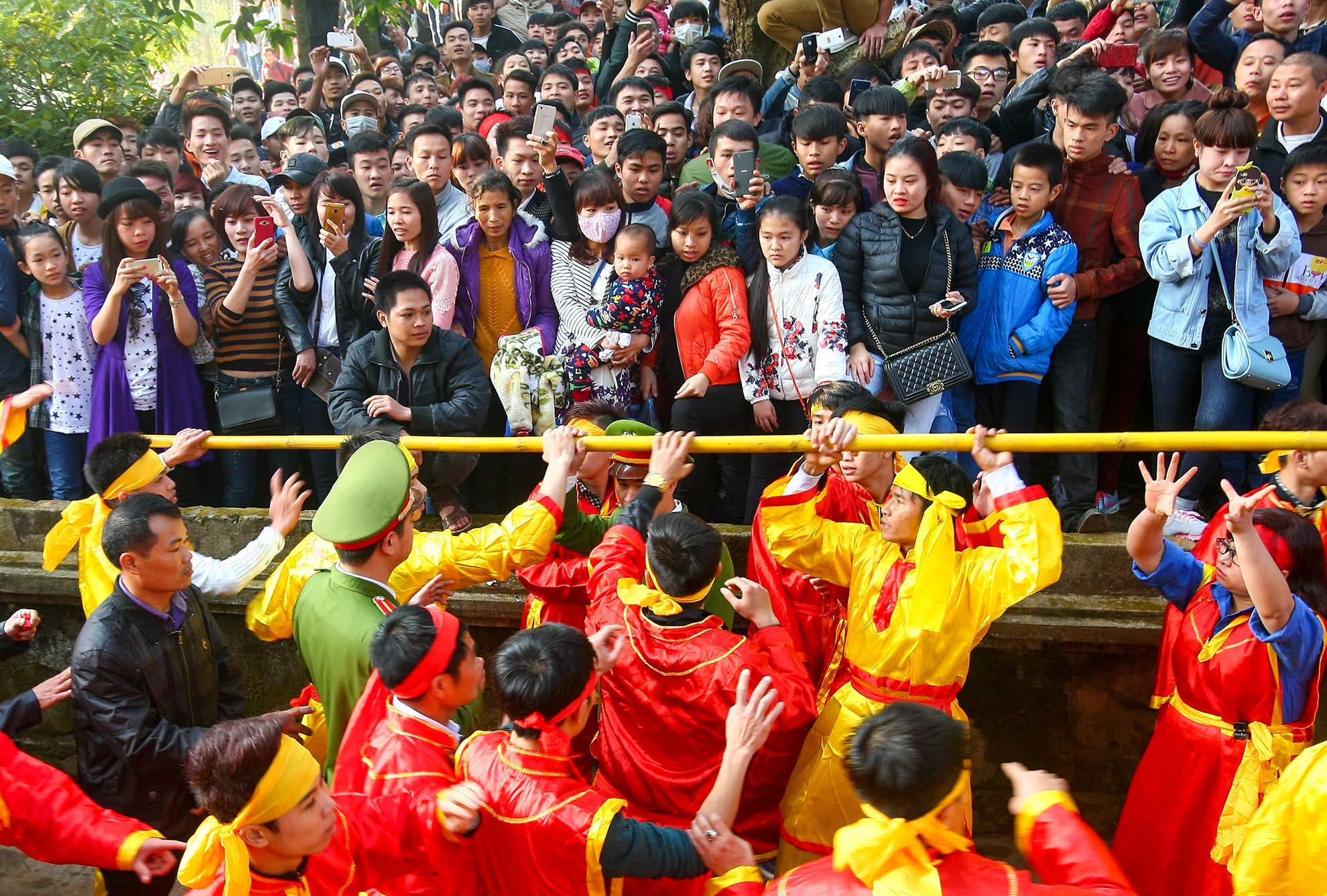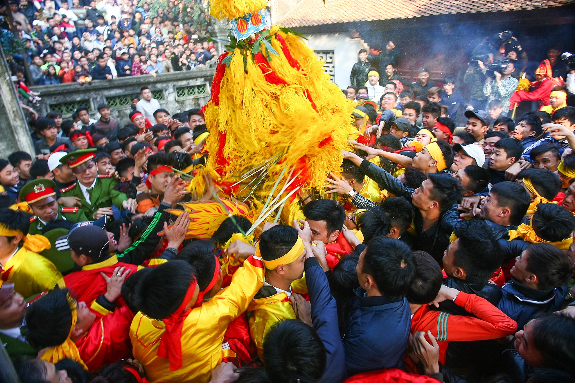 Đoàn tùy tùng rước kiệu hoa tre đến đền Thượng thì hàng chục thanh niên lao vào cướp. Nhiều người cho rằng, đây là tục lệ của lễ hội để lấy may mắn cho cả năm.