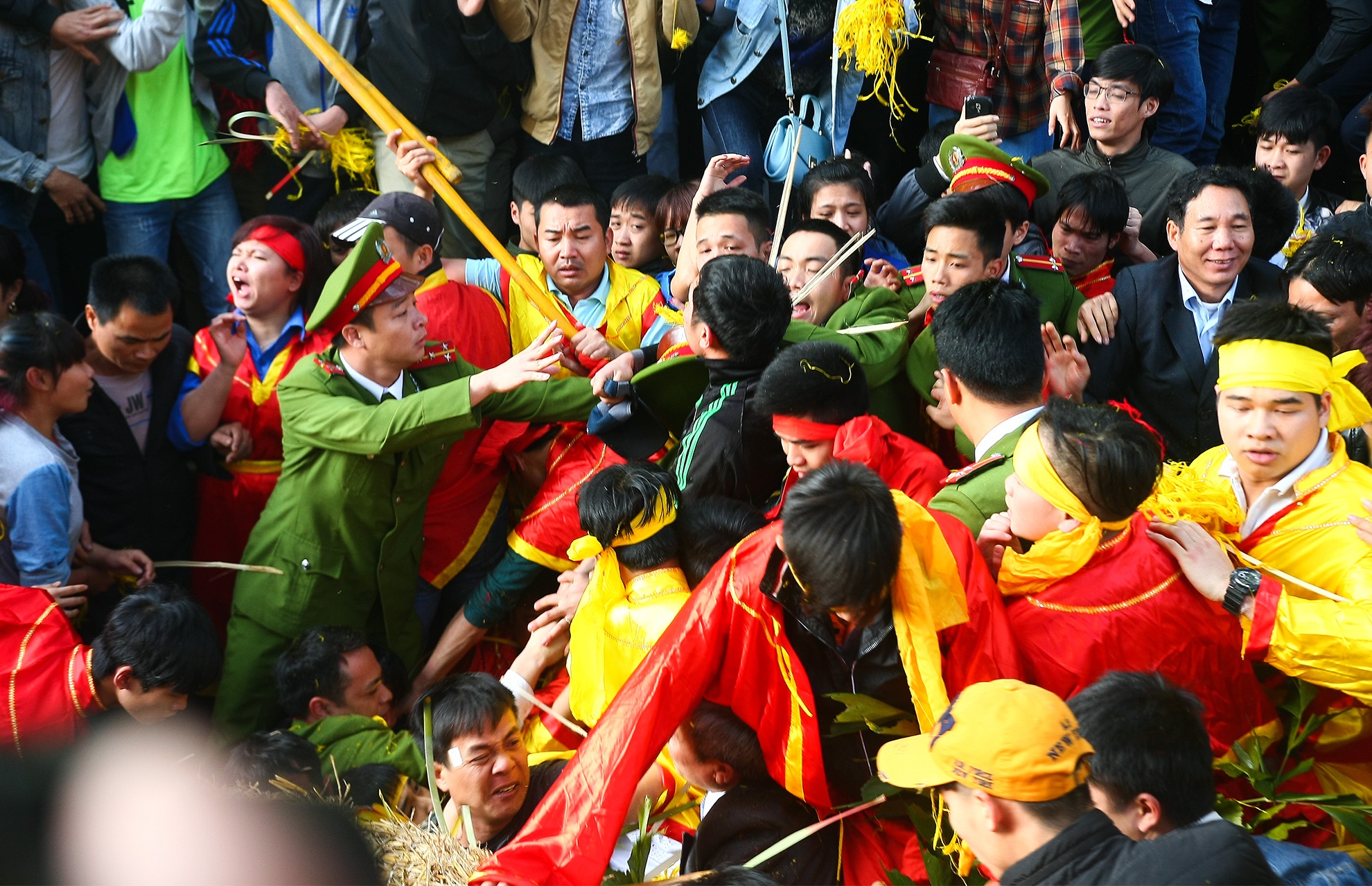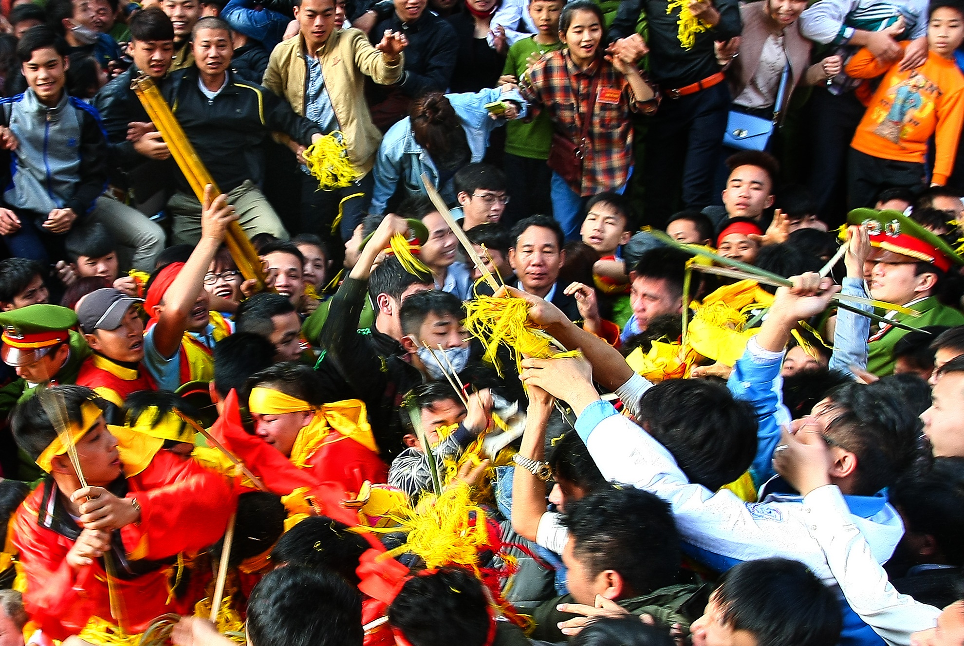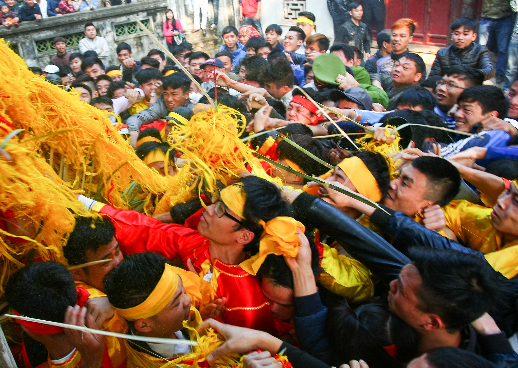 Quang cảnh lễ hội rất náo loạn. Ai cũng muốn giành được dù chỉ là một sợi.