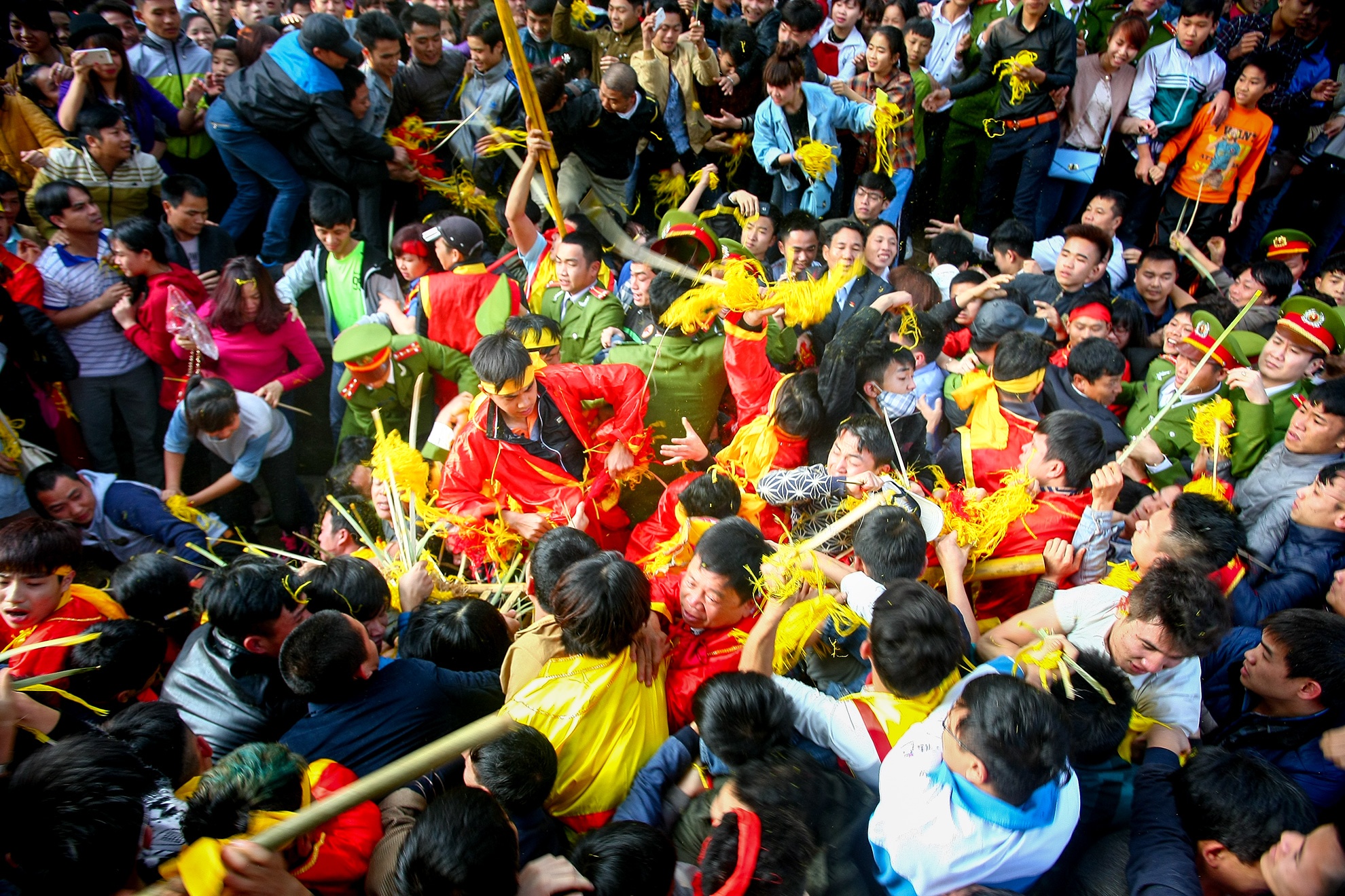Hàng trăm thanh niên lao vào tranh cướp hoa tre với mong muốn có nhiều may mắn trong năm mới tại lễ hội đền Gióng (Sóc Sơn, Hà Nội), sáng mùng 6 Tết.
