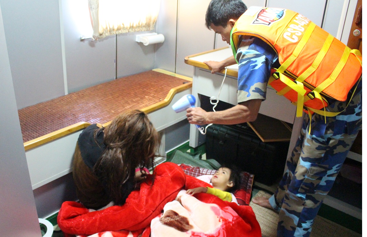 Nỗ lực cứu tàu bất thành, 4 thuyền viên cùng một phụ nữ và một trẻ em đã rời tàu lên phao cứu hộ.