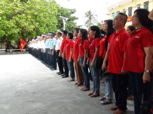| Ông Minh (đứng thứ 2 từ phải qua) trong đoàn góp đá xây Trường Sa chào cờ cùng cán bộ chiến sĩ đảo Nam Yết. |