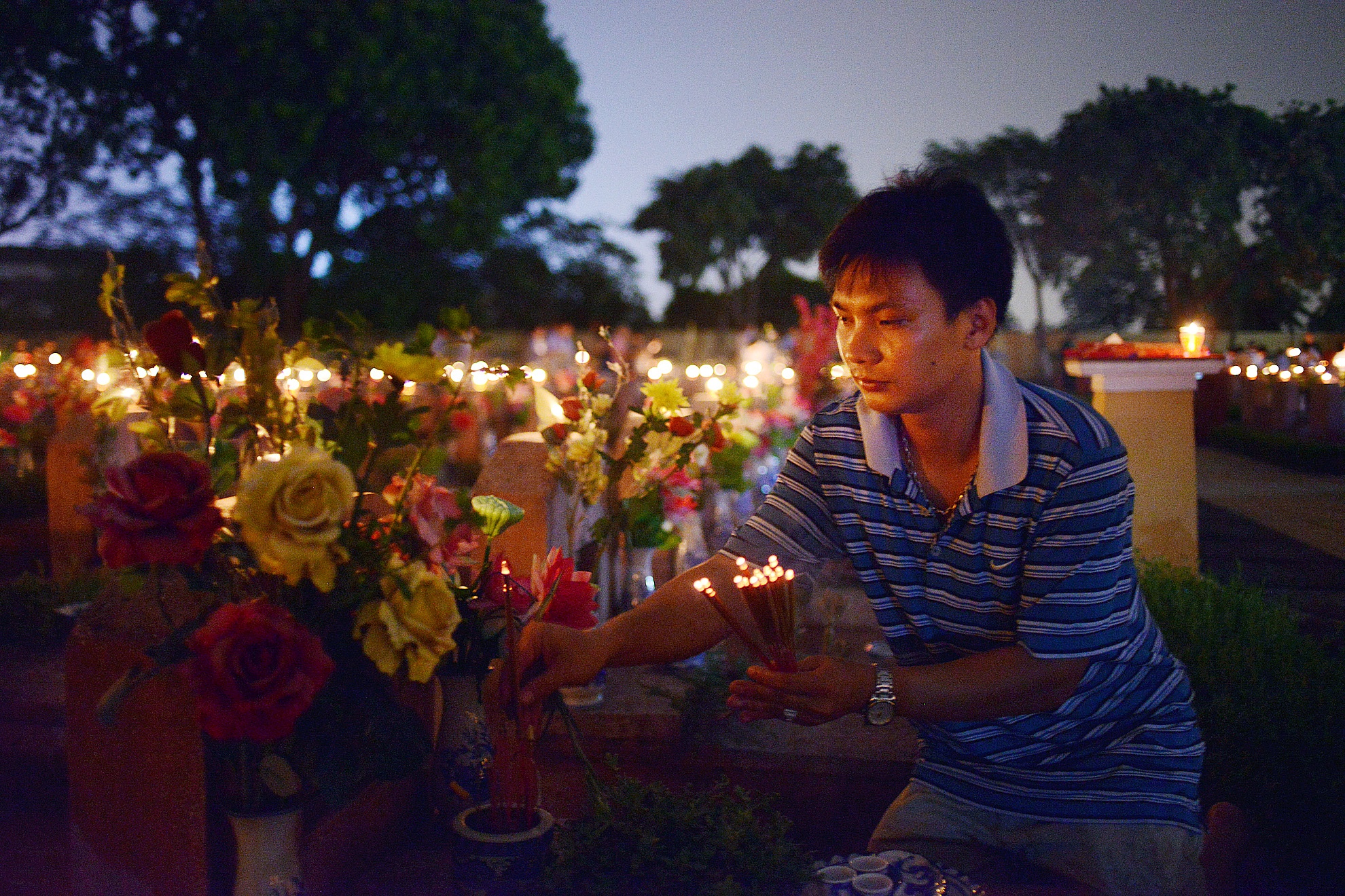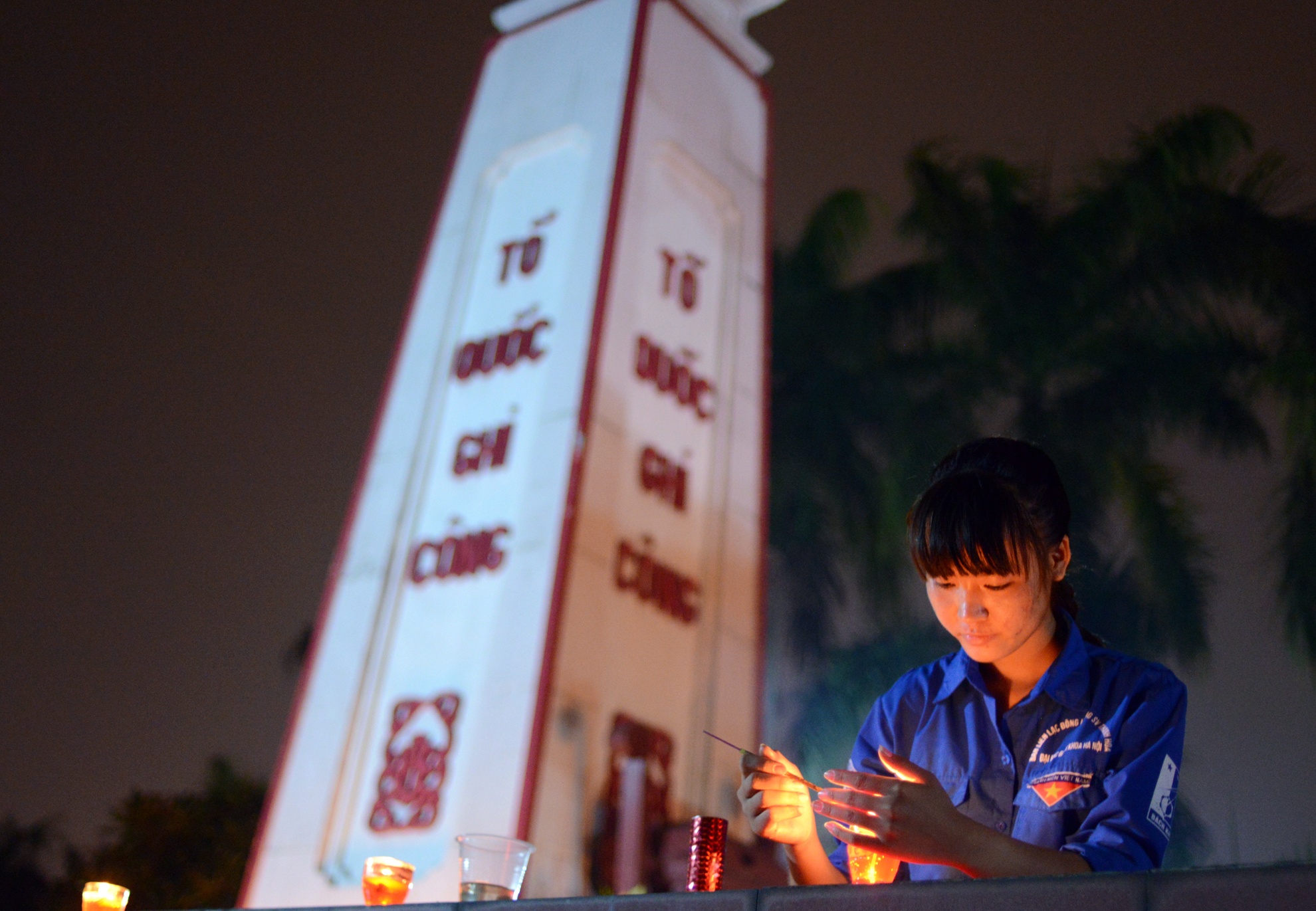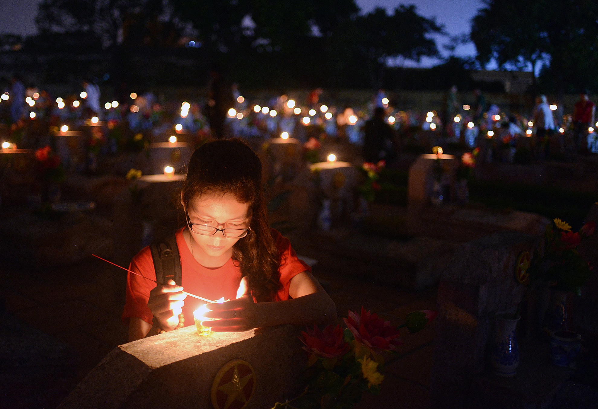 | Nguyễn Thị Lan (Sinh viên Đại học Tài Chính Kế Toán Hà Nội) thấy mình thật may mắn khi được sống trong môi trường đất nước hòa bình độc lập. Tối nay, cô và nhóm bạn cùng trường đến từng ngôi mộ thắp hương. |