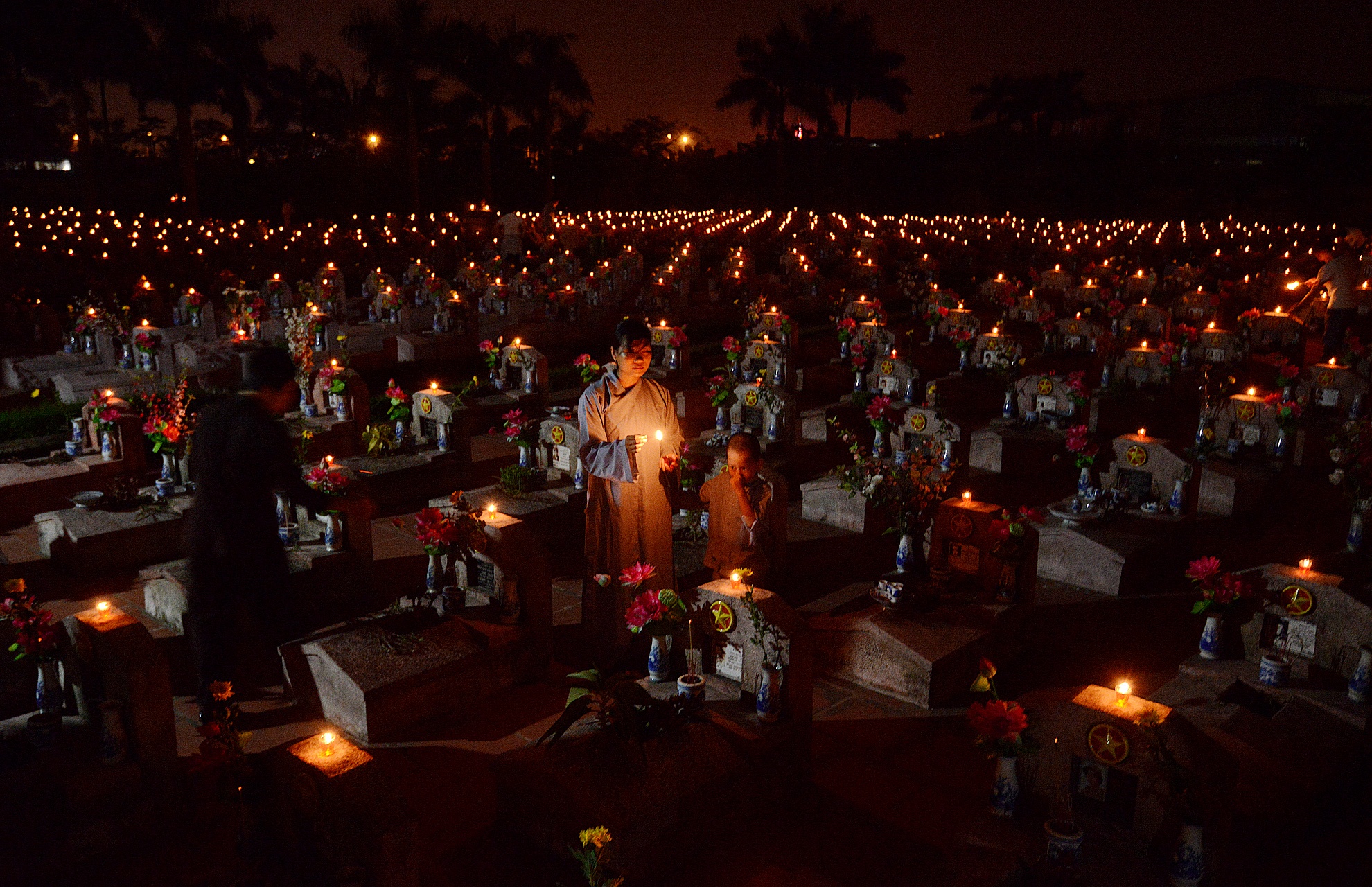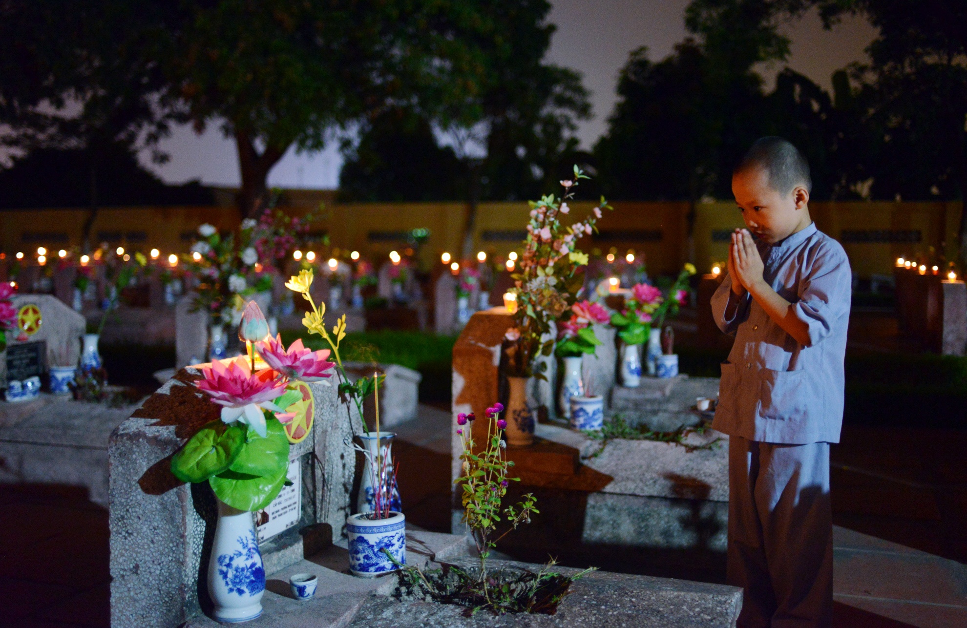 Sau khi các nhà sư làm lễ truyền đăng, truyền hương, nghĩa trang đã bừng sáng.