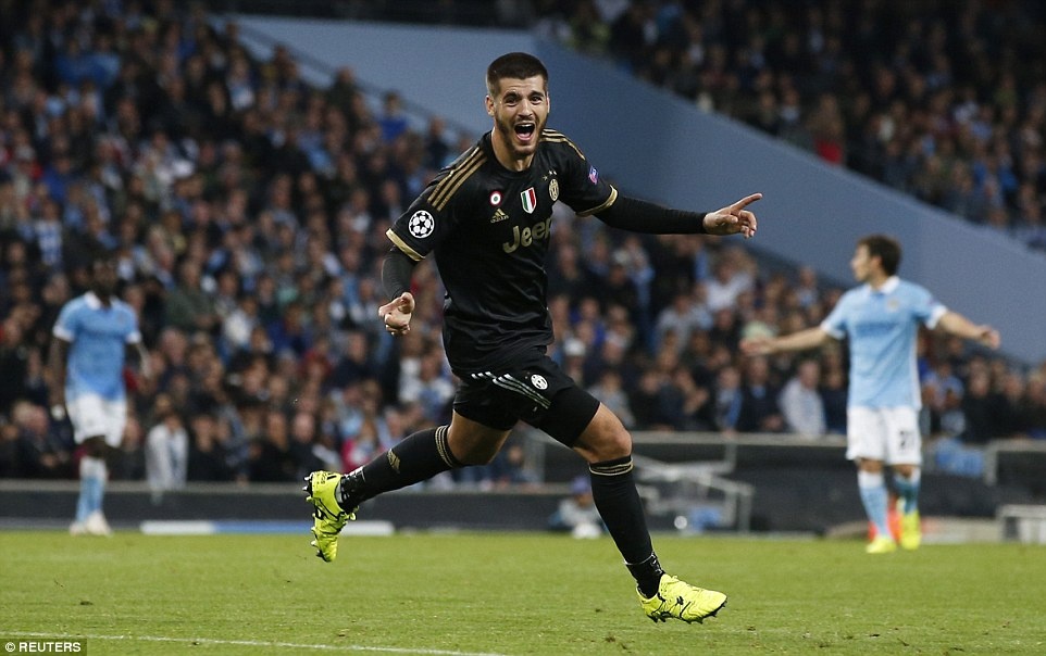 | Phút 81, tiền đạo trẻ Alvaro Morata khiến hàng vạn người hâm mộ Man City tại Etihad phải im lặng khi ghi bàn ấn định tỷ số 2-1 cho Juventus. |