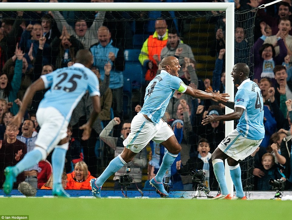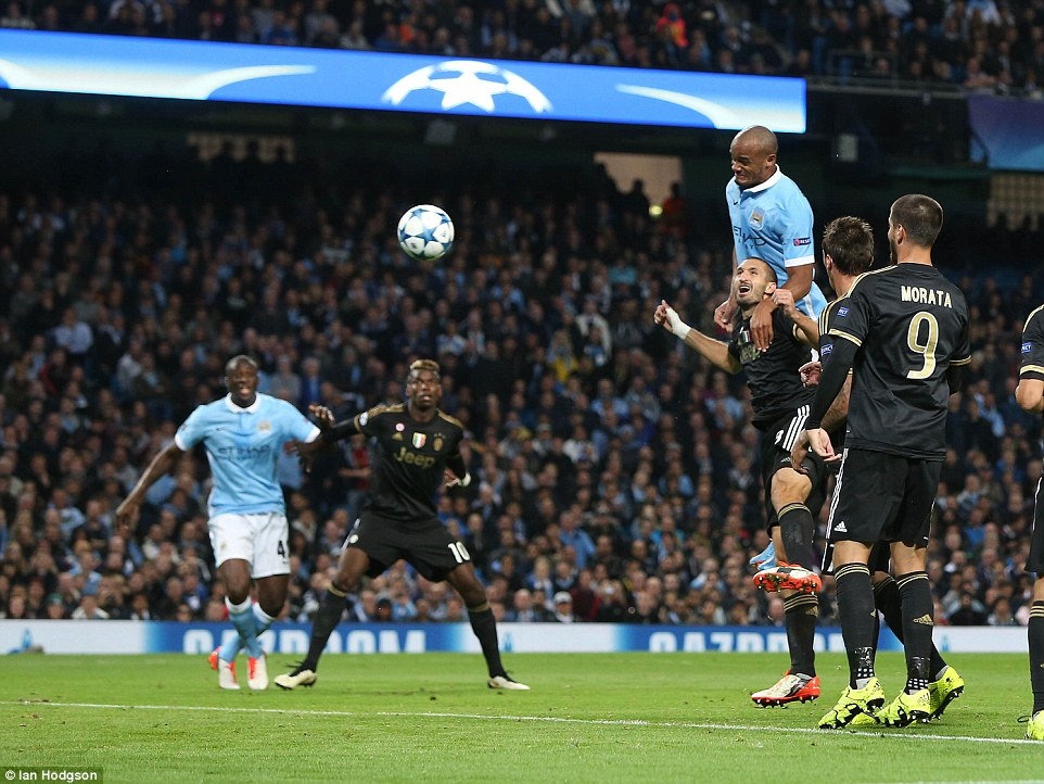 | Man City vươn lên dẫn trước ở phút 57. Từ quả phạt góc bên cánh trái của Silva, Kompany gây sức ép khiến Giorgio Chiellini đánh đầu phản lưới. |