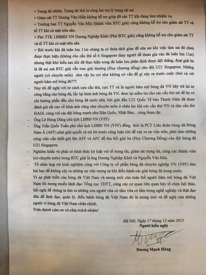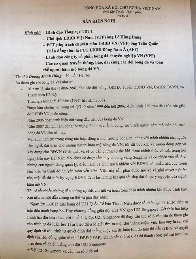 | Bản kiến nghị dài 2 trang của ông Dương Mạnh Hùng về sự cố khiến U21 Việt Nam đánh rơi tấm huy chương đồng ở giải U21 quốc tế hồi tháng 11/2015. |