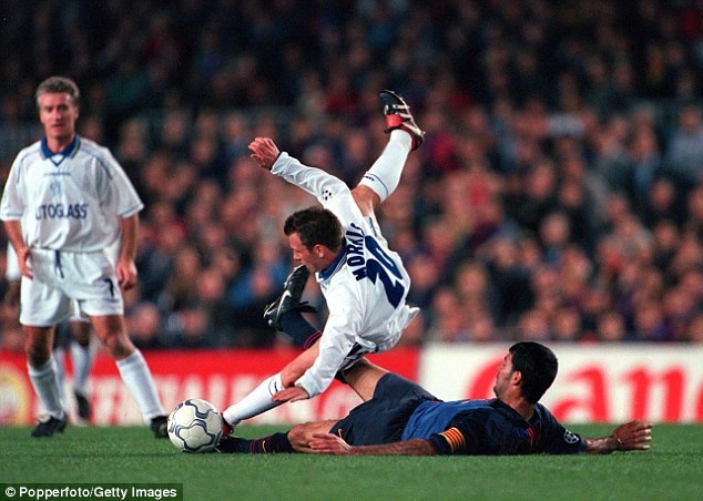 Pha tranh cướp bóng dũng mãnh giữa cựu cầu thủ Pep Guardiola (Barcelona) và Jody Morris (Chelsea) trong trận đấu tại Champions League năm 2000.