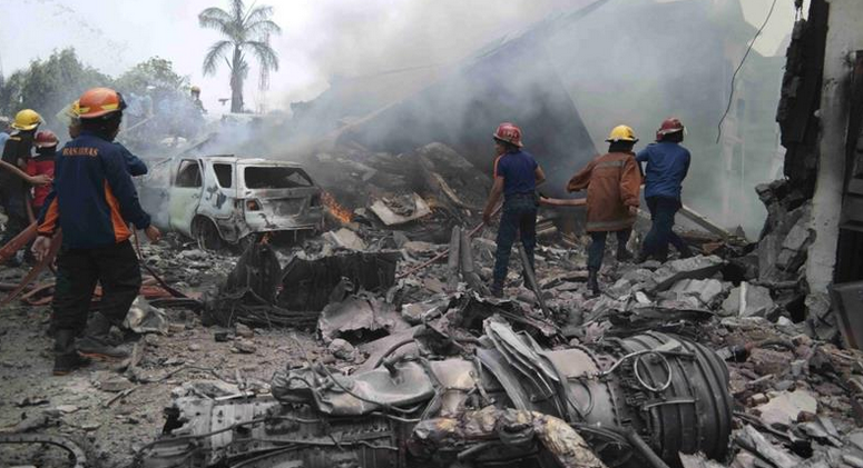 | Binh sĩ của quân đội có mặt để đưa thi thể những người thiệt mạng ra khỏi xác máy bay. Chiếc C-130 chở 113 người, gồm 12 thành viên phi hành đoàn và 101 hành khách, khởi hành từ căn cứ không quân tại thành phố Medan và dự kiến hạ cánh tại Natuna. Tuy nhiên, máy bay rơi xuống một khu dân cư, chỉ 2 phút sau khi cất cánh. Toàn bộ người trên máy bay và ít nhất 3 người trên mặt đất thiệt mạng. Ảnh: Twitter |