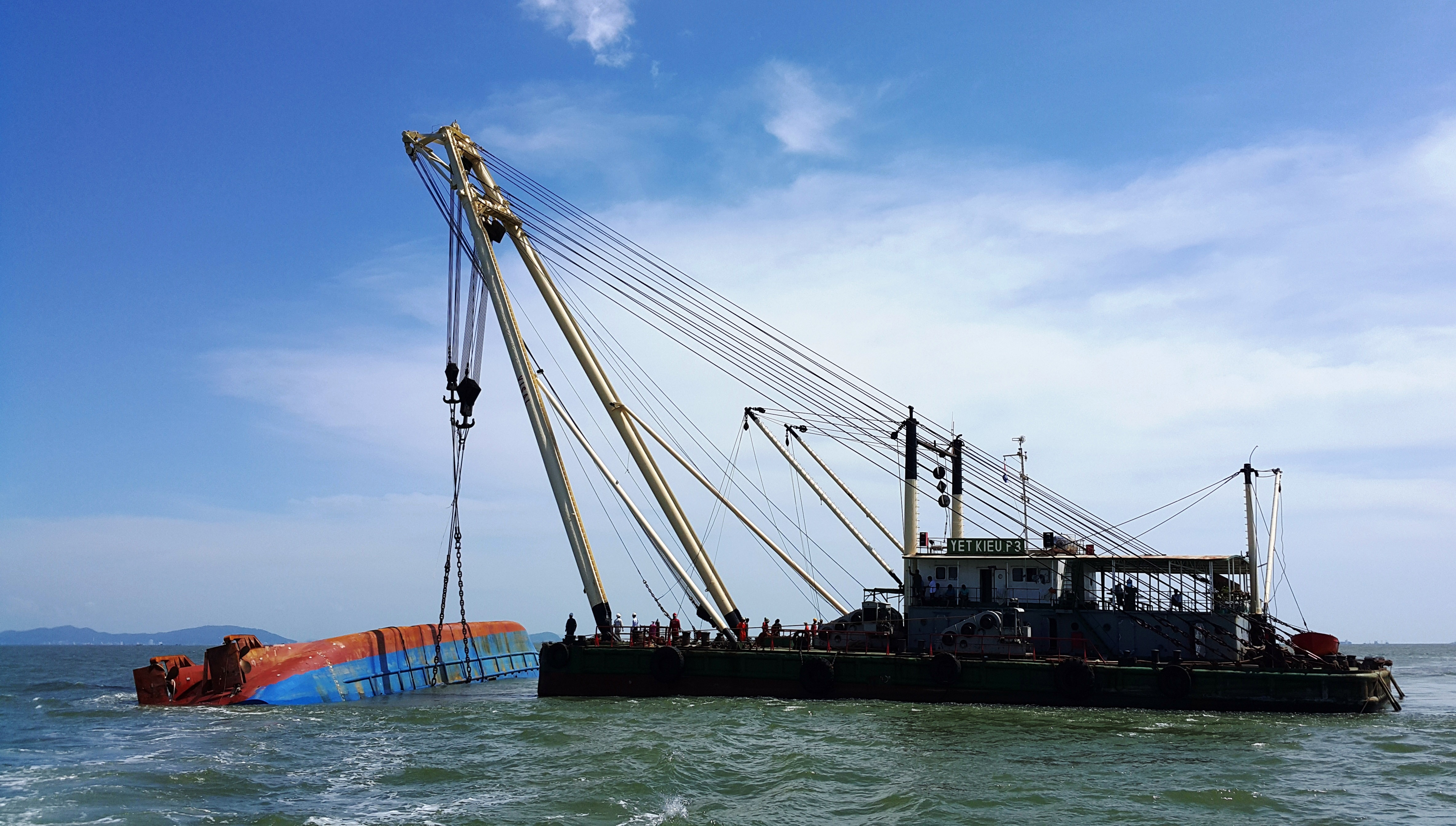 | Tàu cần cầu Yết Kiêu nâng tàu Hoàng Phúc 18. Ảnh: T.N. |