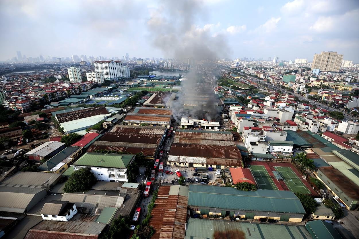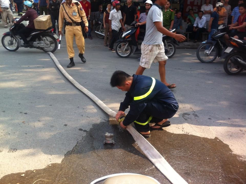 | Nhiều xe cứu hỏa được huy động (trong đó có cả xe của Quân khu thủ đô). Tuy nhiên, do lối tiếp cận điểm cháy là tuyến đường nội bộ, chật hẹp nên các xe chữa cháy không thể quay đầu chạy lấy nước. |