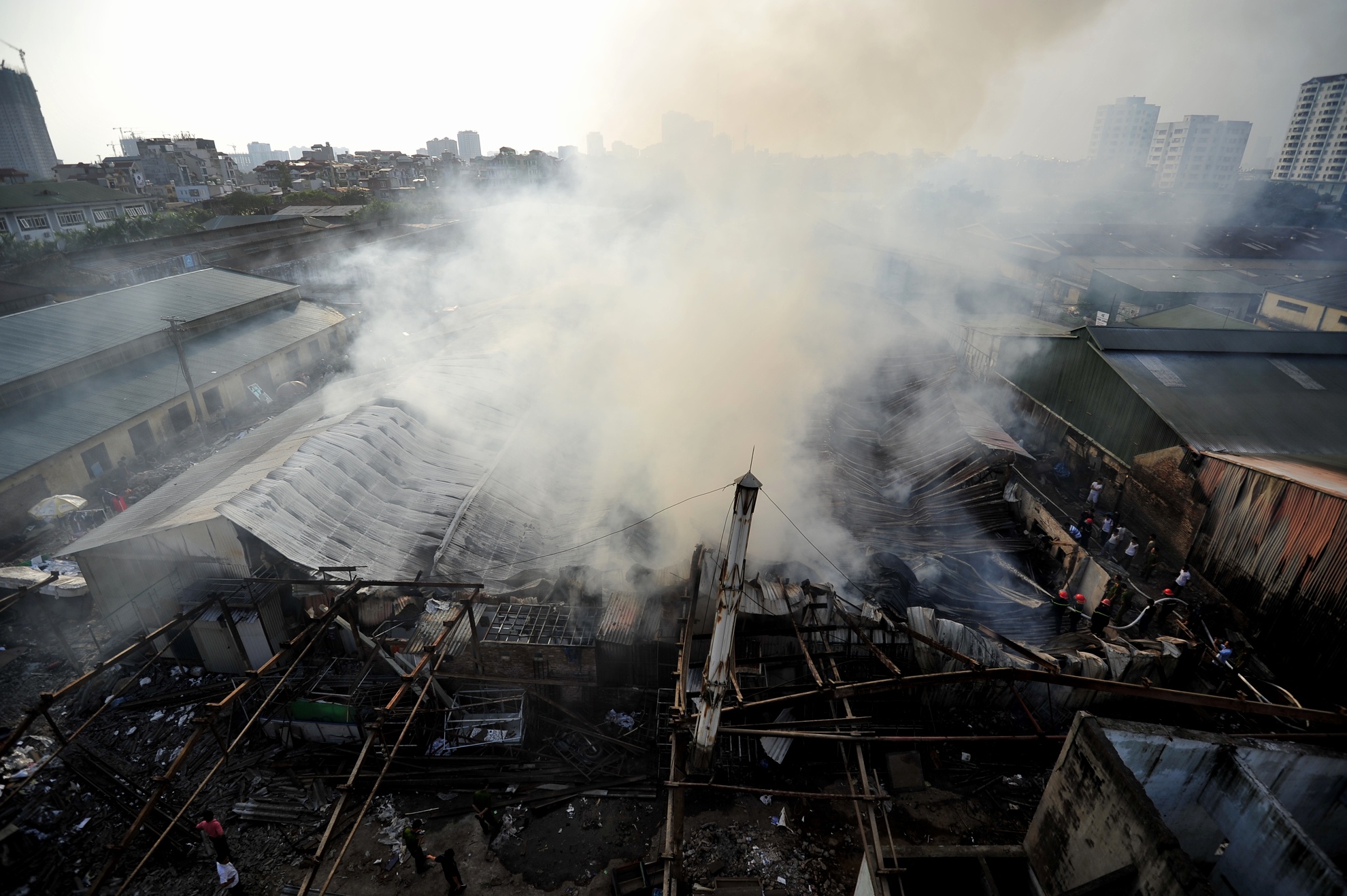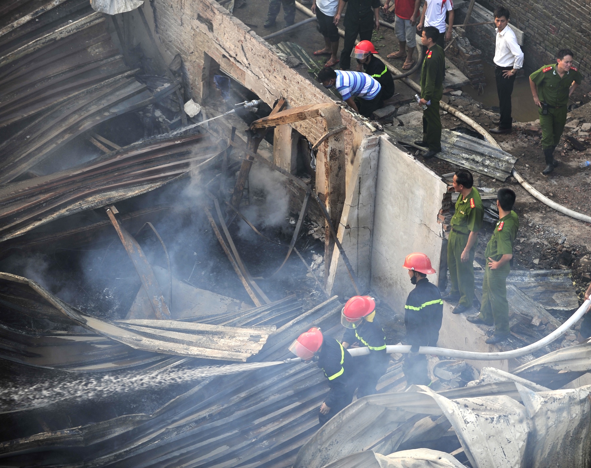 Đến 16h, ngọn lửa cơ bản được khống chế. Hơn 100 lính cứu hỏa của công an, quân đội tiếp tục phun nước hạ nhiệt độ. Nhà xưởng gặp hỏa hoạn được dựng theo kết cấu mái tôn, khung thép, nên dưới tác động của lửa dữ đã nhanh chóng sụp đổ.