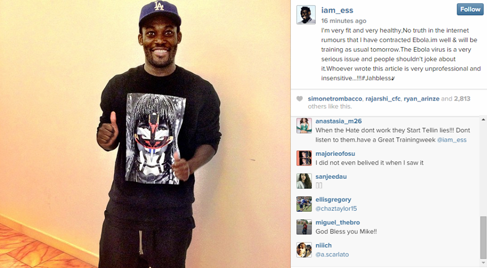 Trước những thông tin thất thiệt về mình, tiền vệ từng thi đấu cho Chelsea đã phải lên tiếng thanh minh trên Instagram, kèm theo một tấm hình chứng minh anh đang hoàn toàn khỏe mạnh: “Những tin đồn trên mạng internet về việc tôi nhiễm Ebola là vô căn cứ. Tôi hoàn toàn khỏe mạnh và sẽ ra sân tập luyện vào ngày mai. Đại dịch Ebola là vấn đề nghiêm trọng và mọi người không nên lấy đó làm trò đùa. Bất cứ ai tung tin này đều là kẻ thiếu chuyên nghiệp và vô lương tâm”.