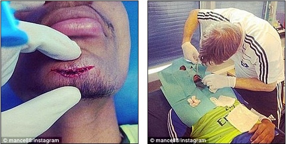 | Nhân viên y tế của Humburg khâu chiếc cằm bị rách của Mancienne. Ảnh: Daily Mail. |