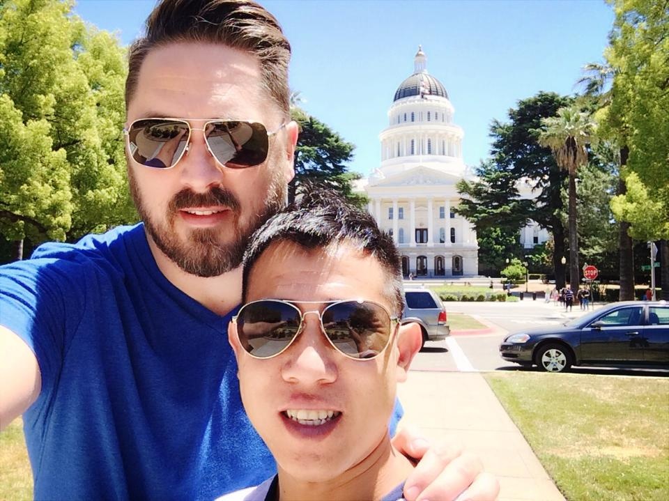 Năm 2011, Quang Huy từng tâm sự: "Lúc đầu, chúng tôi không nghĩ tới chuyện đám cưới nhưng bây giờ thấy nhiều bạn kết hôn hết rồi cũng rất thích". Trong ảnh là khoảnh khắc tình tứ chăm sóc cho nhau của cựu thành viên nhóm The Bells và người bạn đời ngoại quốc. Hai năm sau, Quang Huy trở thành nam ca sĩ đầu tiên trong Vbiz công khai đám cưới đồng tính. |