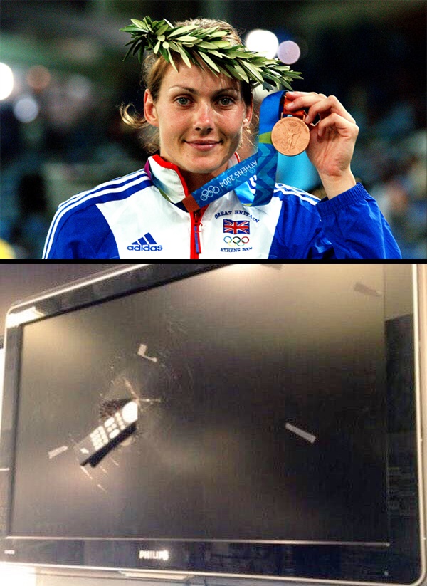 Cú ném với lực tay rất mạnh của VĐV chuyên nghiệp đã làm chiếc tivi tội nghiệp vỡ toác. Đáng ngạc nhiên, chiếc điều khiển không rơi xuống mà găm lại trên màn hình.