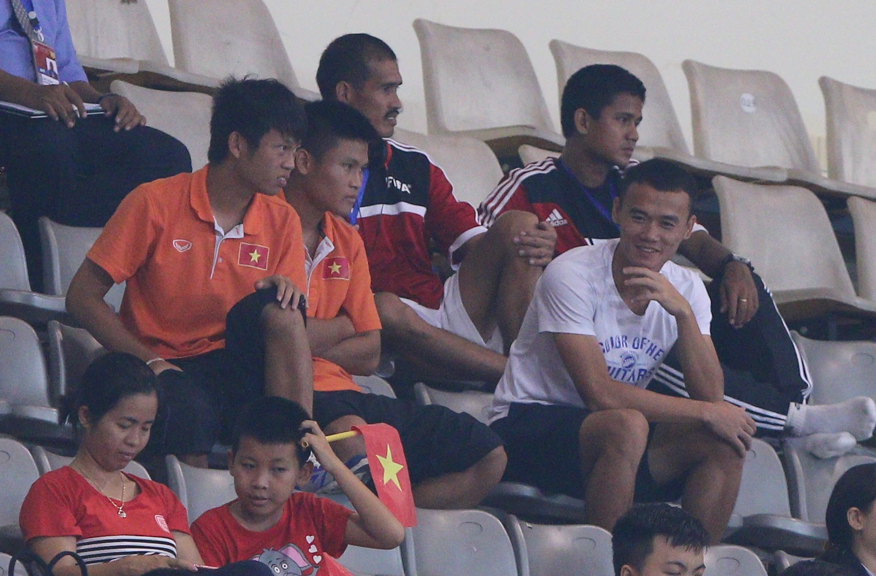 | Xuân Nam (áo trắng) ngồi trên khán đài cạnh 2 cầu thủ U19 Việt Nam bị chấn thương không thể thi đấu là Thanh Sơn (trái) và Tuấn Hải. Tiền đạo Nguyễn Xuân Nam từng là ngôi sao của U19 Việt Nam ở giải U19 Đông Nam Á 2011 với danh hiệu Vua phá lưới, còn đội tuyển giành ngôi á quân, sau khi thất bại ở loạt sút luân lưu trước U19 Thái Lan trong trận chung kết. |