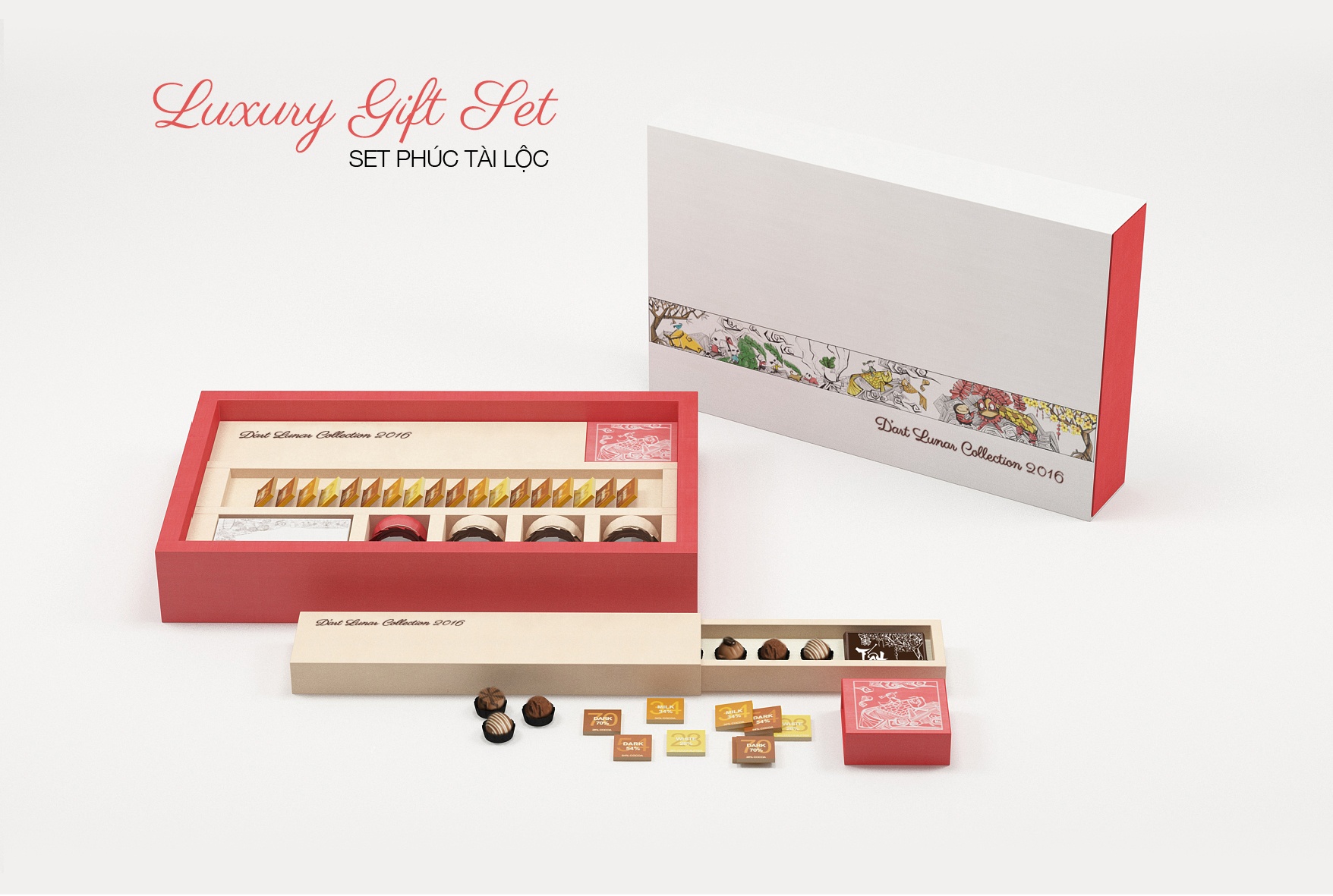 Vẫn mang dấu ấn dân gian trong từng sản phẩm, hộp quà Phúc Tài Lộc mang chút phá cách khi kết hợp sản phẩm chocolate nguyên chất thượng hạng từ dòng chocolate sữa ngọt ngào đến dòng chocolate đắng đậm đà, để cùng nhau chia sẻ các cung bậc cảm xúc khác nhau trong những ngày sum họp đầm ấm.