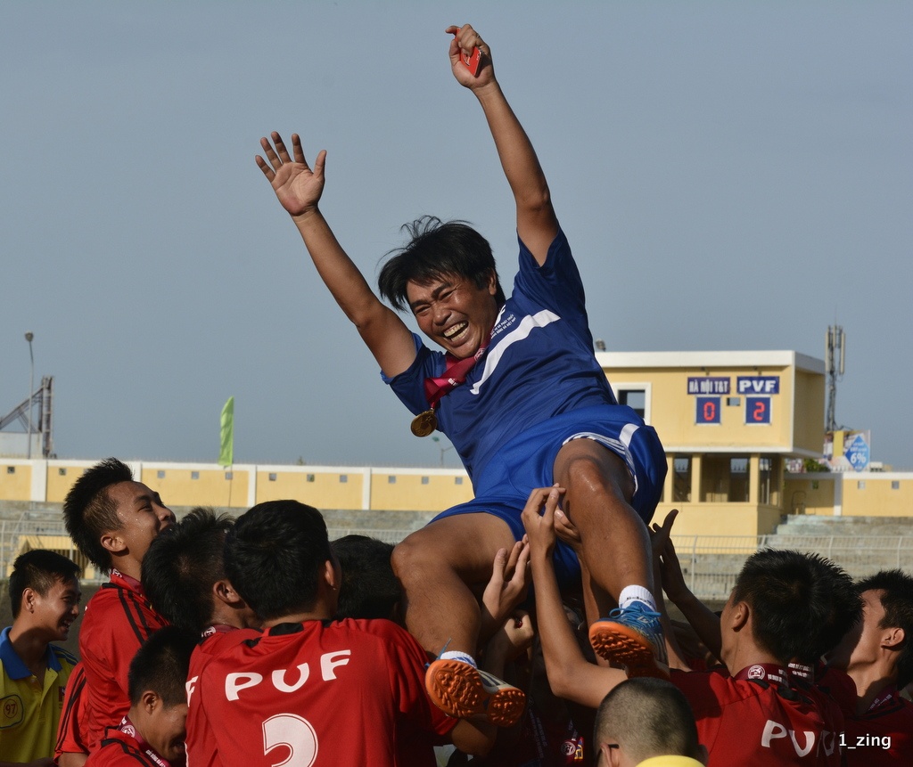 | HLV Trần Minh Chiến, cựu danh thủ thế hệ vàng bóng đá Việt Nam được các học trò tung hô mừng chức vô địch. |