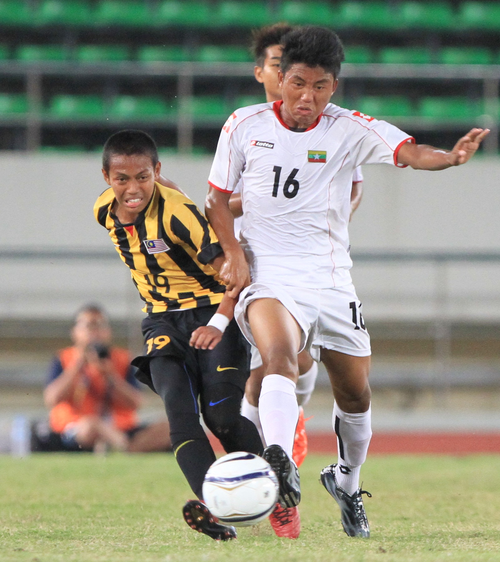 | Suốt 45 phút đầu trận, U19 Myanmar mỗi khi có bóng thường chỉ chuyền dài lên cho tiền đạo đá cắm Aung Zaw Phyo. Cầu thủ mang áo số 10 vất vả tranh chấp bóng và thường thua thiệt trước những hậu vệ có thể hình vượt trội của U19 Malaysia. |