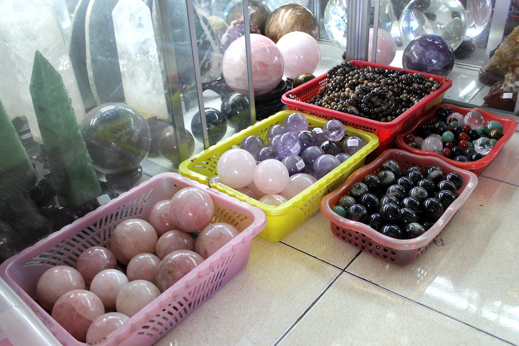 | Những viên đá phong thủy bóng loáng được bày biện ngay ngắn trên kệ... |