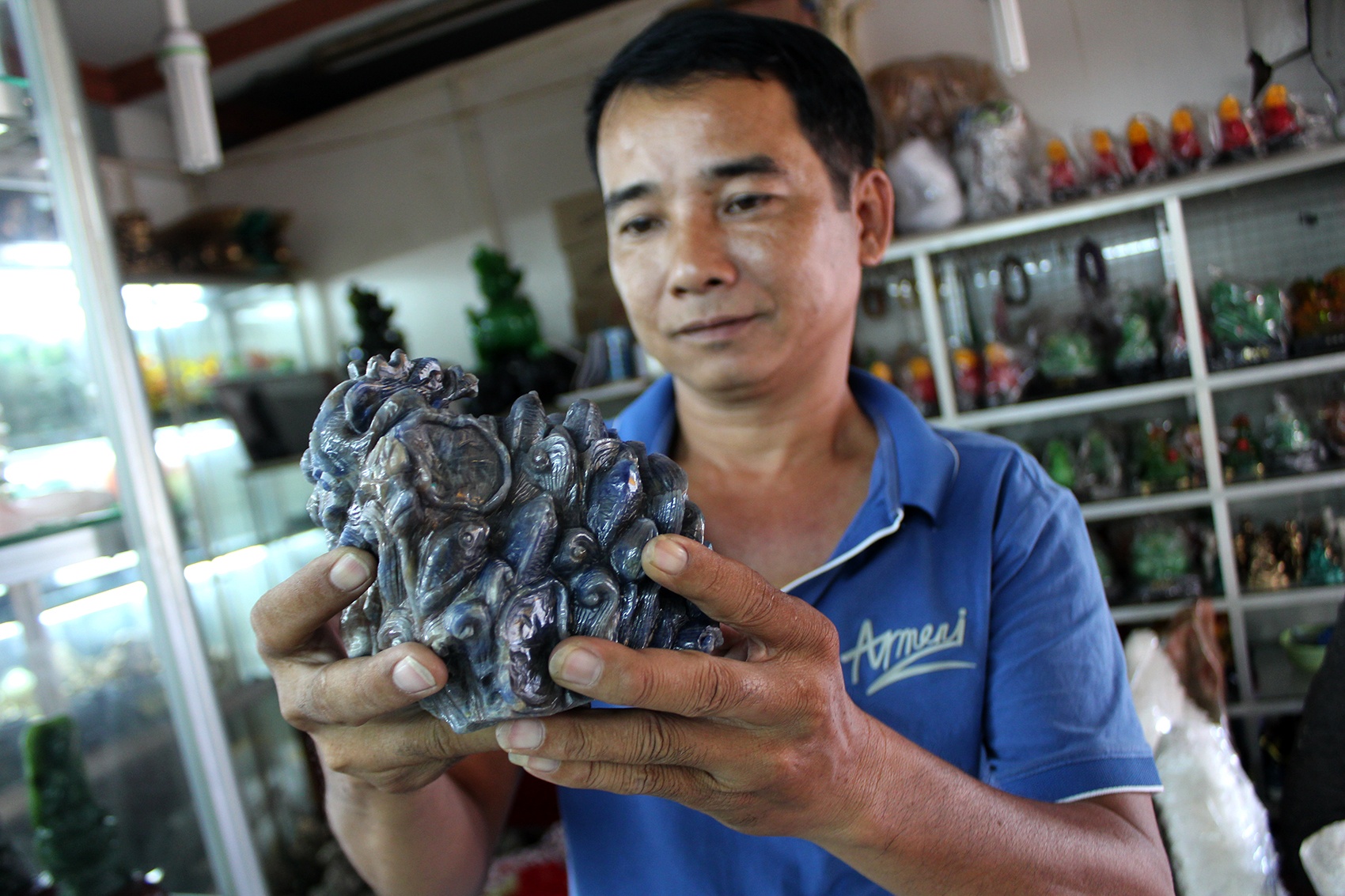 | Anh Tùng chủ một tiệm phong thủy trên đường Võ Văn Kiệt cho biết: " Để đầu tư một cửa hàng như thế này tôi đã phải bỏ ra hơn 2 tỷ đồng để mua đá. Trước khi mở cửa hàng, tôi đã học nghề 20 năm, nhưng ngày nay nhiều mặt hàng đá nhân tạo được làm rất tinh xảo rất khó phân biệt thật, giả". |