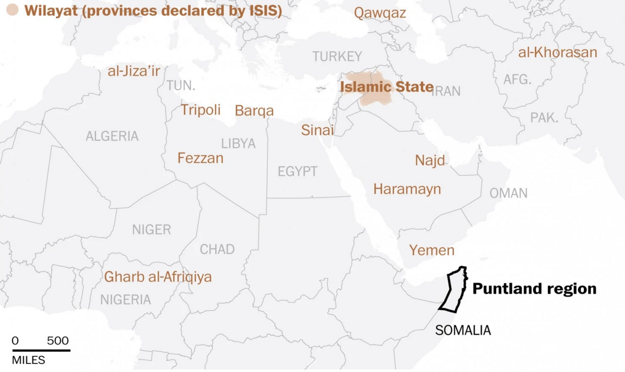 | Bản đồ thể hiện lãnh địa của Nhà nước Hồi giáo tự xưng (Islamic State) và vùng Puntlan, Somalia. Đồ họa: Washington Post |
