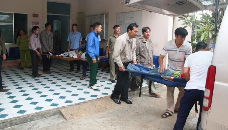 | Một phụ huynh không thể đứng vững khi đến bệnh viện huyện Cần Giờ nhận thi thể con trai. |