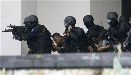 | Các thành viên của Detachment 88 luyện tập giải cứu con tin tại khách sạn Borobudur, Jakarta (Indonesia) tháng 3/2010. Ảnh: AFP. |