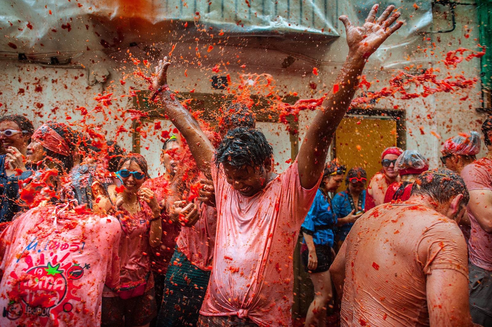 | Mọi người ném cà chua vào những người khác. Ảnh: Getty Image. |