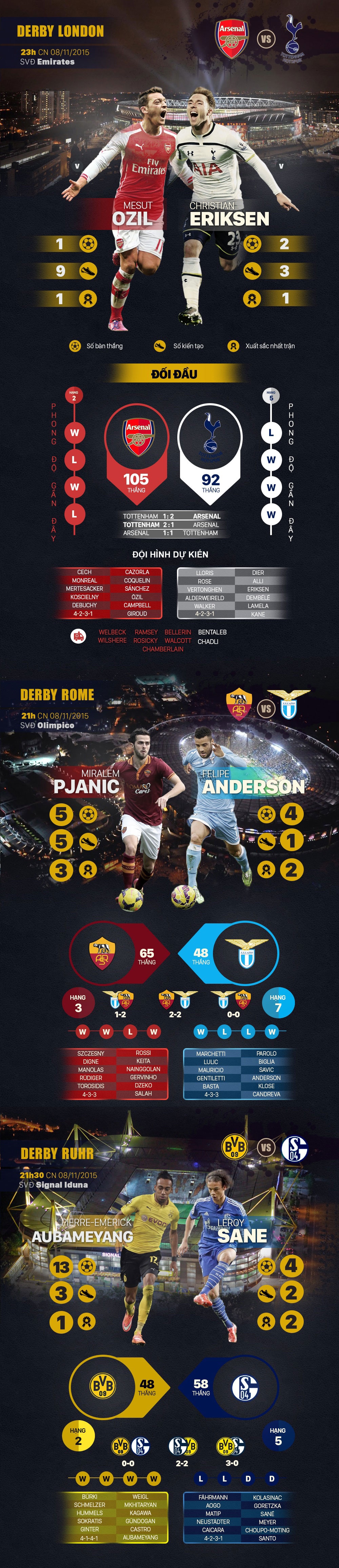 Ngoài trận derby London giữa Arsenal và Tottenham, người hâm mộ còn được chứng kiến cuộc so tài nảy lửa Roma vs Lazio và Dortmund vs Schalke diễn ra ngày 8/11.