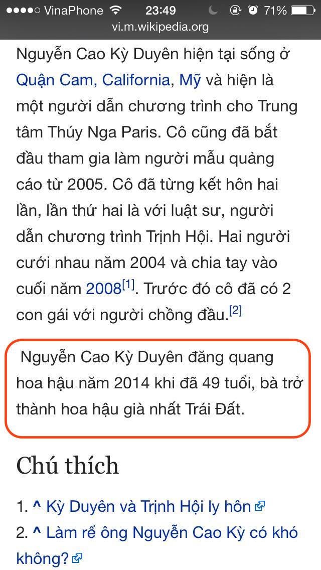 Theo thống kê của Wikipedia Việt Nam, các biên tập viên của trang này đã rất vất vả để sửa lại những nội dung bị thêm thắt vào trang tiểu sử của MC Nguyễn Cao Kỳ Duyên. Chỉ trong một buổi tối, đã có 50 phiên bản tiểu sử hài hước, phong cho MC Nguyễn Cao Kỳ Duyên làm hoa hậu được tạo trên Wikipedia. Một vài người dùng quá khích đã bị xóa tài khoản vì nhiều lần tạo ra những thông tin sai lệch.