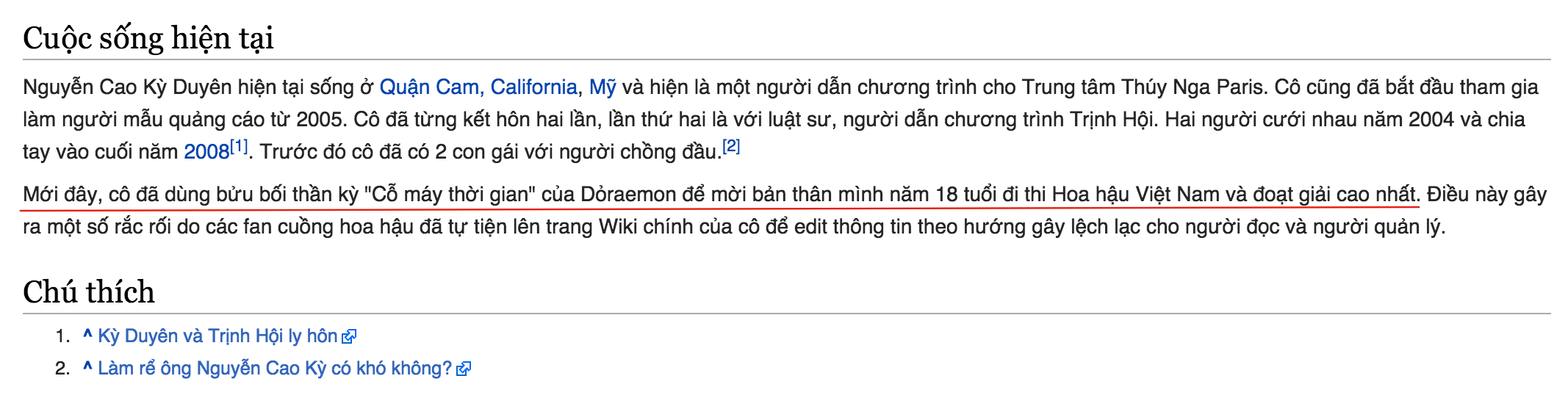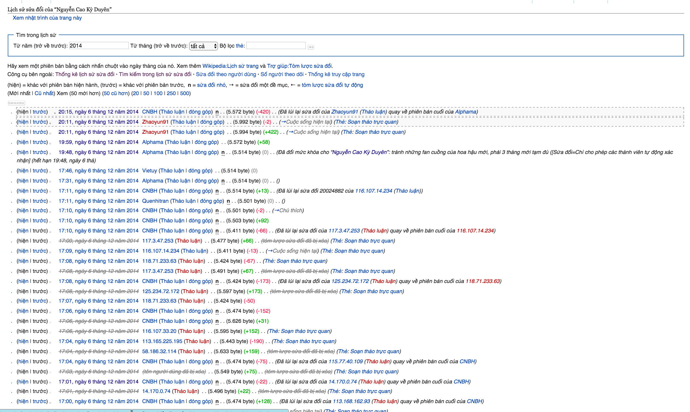 | Lịch sử sửa đổi trang Nguyễn Cao Kỳ Duyên trên Wikipedia như một bãi chiến trường với hơn 50 lần sửa đổi nội dung, nhiều phiên bản xuyên tạc bị gạch bỏ, nhiều thành viên "quá khích" đã bị xóa tài khoản. |