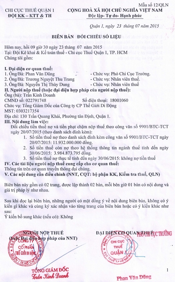 Bên cạnh Nguyễn Kim, trong ngày hôm nay, Công ty cổ phần Thế giới Di động cũng nhận được văn bản từ Chi cục Thuế quận 1, TP HCM. Nội dung biên bản cũng xác nhận Thế giới Di động không nợ thuế.