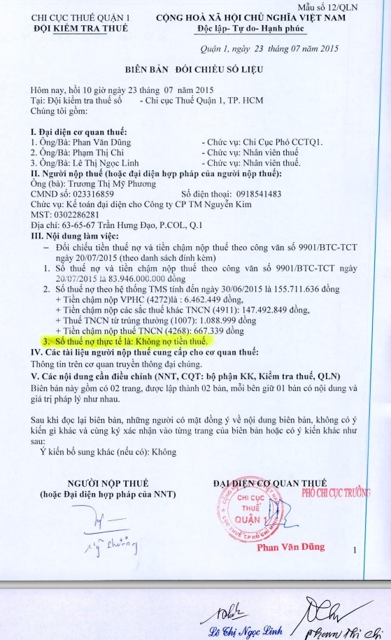 | Biên bản Đối chiếu số liệu thuế của Nguyễn Kim. Ảnh: Nguyễn Kim. |